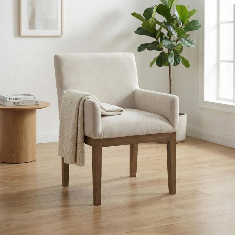 Bring a touch of refined elegance to your dining space or home office with this stunning light gray armchair. Expertly crafted with a sturdy wood frame in a rich brown finish, this chair features premium textured fabric upholstery that offers both durability and a soft, inviting feel. Its classic silhouette and neutral palette seamlessly blend with modern farmhouse or transitional decor, providing a high-end look and exceptional support for long dinners or productive work sessions.
