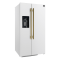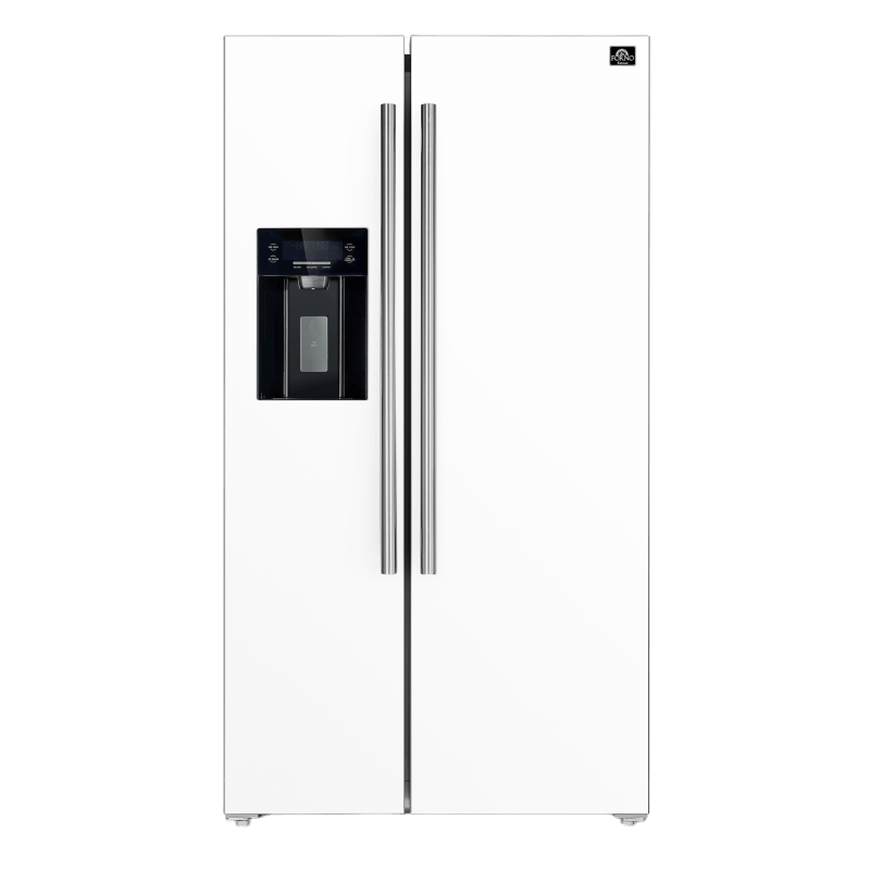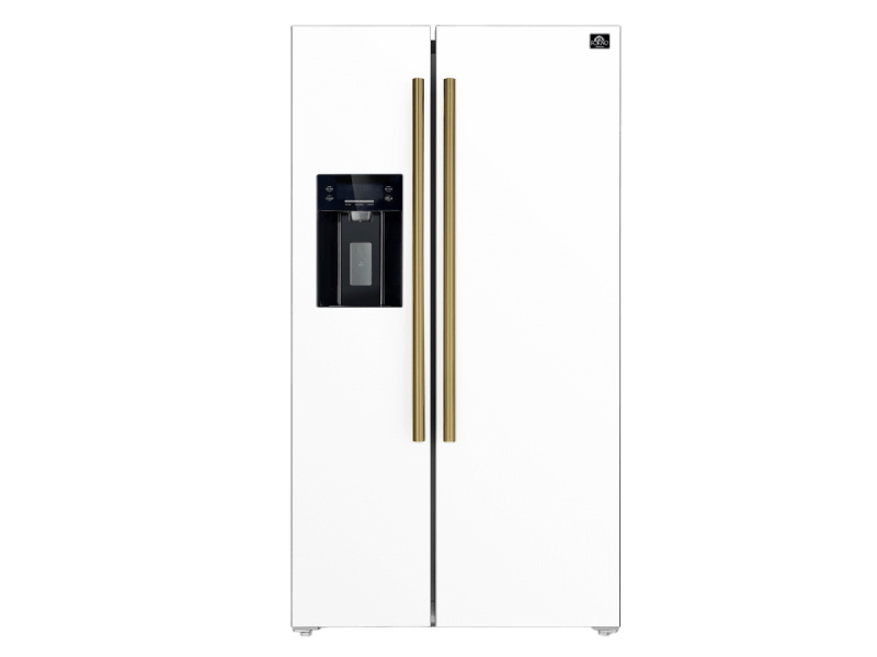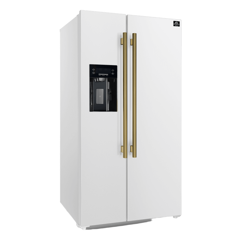 The Forno Salerno 36 Inch side-by-side white refrigerator delivers optimal performance and maximizes storage efficiency. The compressor inverter guarantees energy efficiency, quiet operation, and precise temperature control for optimal freshness. With a frost-free multi air flow cooling system, this appliance boasts a 20 cu.ft. capacity and adjustable shelving for versatile grocery storage. Experience convenience with the water and ice dispenser, featuring a touch screen control for intuitive access to ice options and temperature controls. The Fresh Food storage capacity of 13.48 cu.ft. includes 4 spill-proof shelves, 3 door bins, 1 gallon bin, and 2 crisper drawers. The 6.53 cu.ft. Freezer storage offers 3 spill-proof shelves, 2 door bins, and 2 storage drawers, ensuring optimal organization. This refrigerator is ENERGY STAR Certified for efficiency, and high-efficiency LED lighting minimizes food spoilage. Antique brass handles add an elegant finishing touch to this high-performing and stylish appliance.