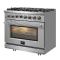 The Massimo 36 Inch Dual Fuel Range delivers professional style and durability to your home kitchen with its robust stainless-steel design. The cooktop features 6 sealed burners, 83,000 BTU output which one is a 20,000 BTU dual-ring burner that can reach a simmer of 1,000 BTU for precise simmering. Continuous cast iron grates ensure stability over the enamel cooktop cavity, containing spills for easy cleaning. The 5.36 cu.ft. true convection fan oven boasts a blue enamel interior, making cleaning a breeze. The 3-layer glass oven door window retains heat and provides a clear view. With a powerful 6,300 Watts output, this oven excels in baking, roasting, and broiling. Included are 2 telescopic oven racks, wok support, griddle, air-fryer kit with drip pan, a NEMA 14-50P power cord and an LP conversion kit. Housed in a high-grade stainless steel body with illuminated zinc knobs, the Massimo offers a stylish, long-lasting addition to your kitchen.
