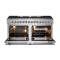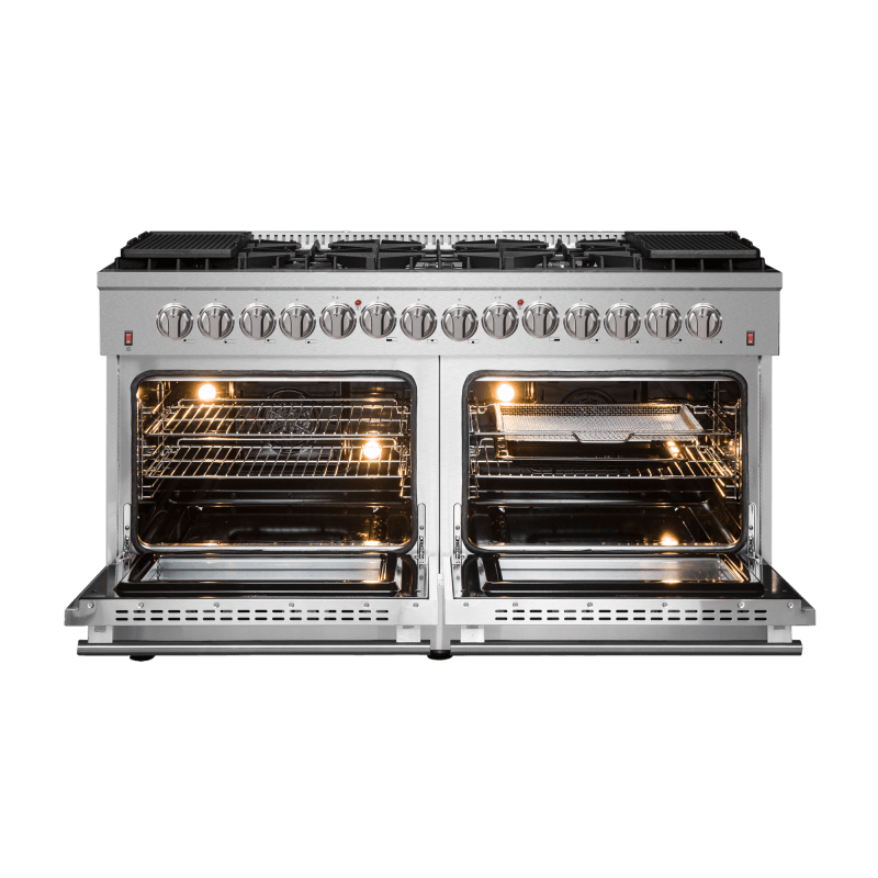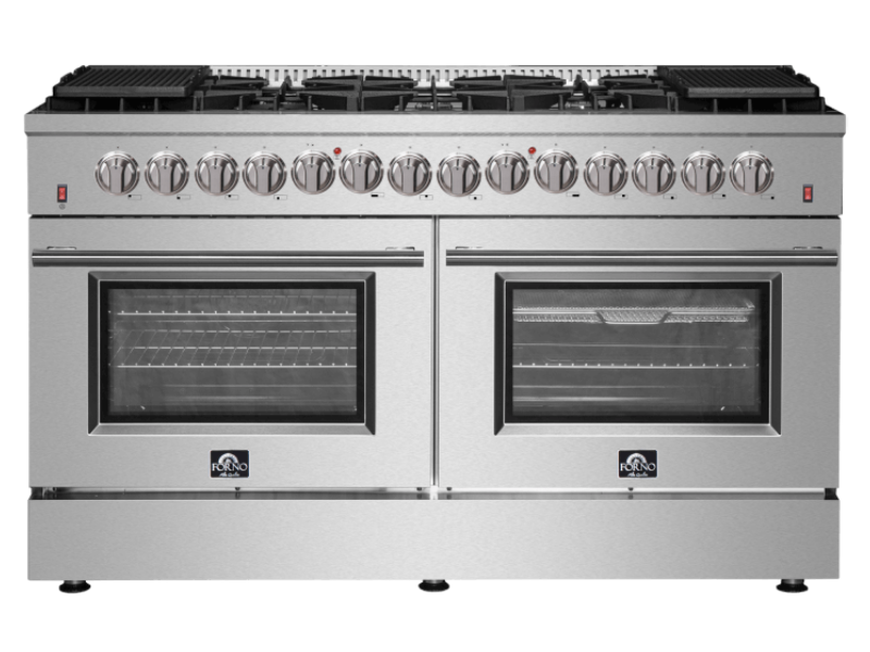 The Forno Galiano 60-Inch dual fuel range, combining professional styling and performance with its durable stainless-steel design. The cooking surface features 10 sealed burners with a total output of 142,000 BTU, including 2 powerful 20K dual-ring burners for boiling, searing, and simmering tasks like melting chocolate or sauces. The continuous cast iron grates ensure maximum stability for cookware and easy sliding of pans off hot burners. With two ovens boasting a combined 8.64 cu.ft. capacity and a total output of 12,600 Watts, this range offers ample power for baking, roasting, and broiling. Both ovens are encased in a black enamel interior and equipped with a true convection fan element of 1500 Watts for fast, precise, and consistent cooking. The 3-layer glass oven door window allows for easy viewing. Included with the range are 4 easy-access oven racks, 2 reversible griddles, an air fryer basket with a drip pan, a wok support, an LP conversion kit, and a NEMA 14-50P power cord for easy installation. Additionally, the zinc-coated metal knobs with bezel rings are designed to maintain their beauty for years to come, adding a touch of sophistication to your kitchen space.