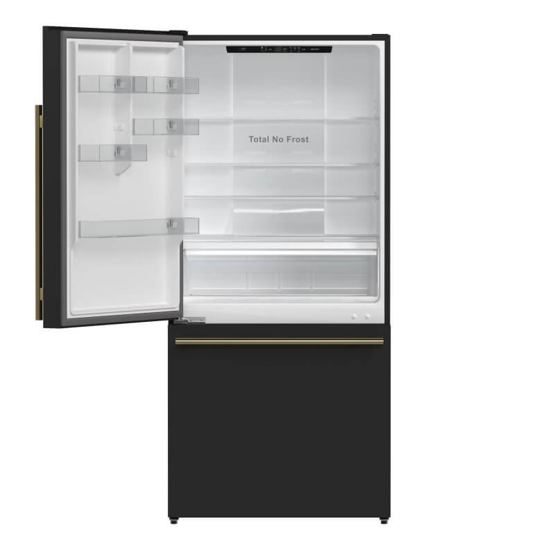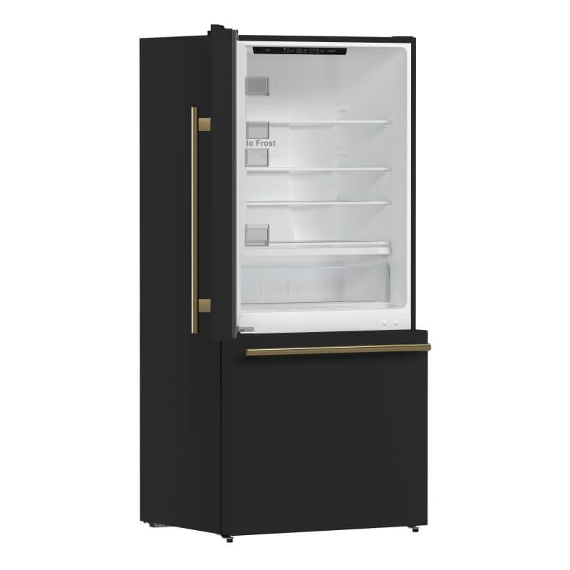 Introducing the FORNO Espresso Milano 31 Inch Bottom Freezer Refrigerator with ice maker that seamlessly blends style and functionality. Its compact 31 Inch size and 17.2 cu ft capacity offer ample storage without compromising aesthetics. Two full-width freezer drawers optimize organization, while digital touch control ensures precise temperature settings and real-time monitoring. The black finish door maintains a modern look effortlessly. Swift temperature adjustment with Super Cool and Super Freeze safeguards your groceries quality. ENERGY STAR Certified for efficiency, and high-efficiency LED lighting reduces food spoilage. Antique brass handles add an elegant touch, and adjustable features, including shelves, door bins, and a full-width crisper drawer, enhance user-friendliness. Upgrade your kitchen with style, convenience, and freshness!