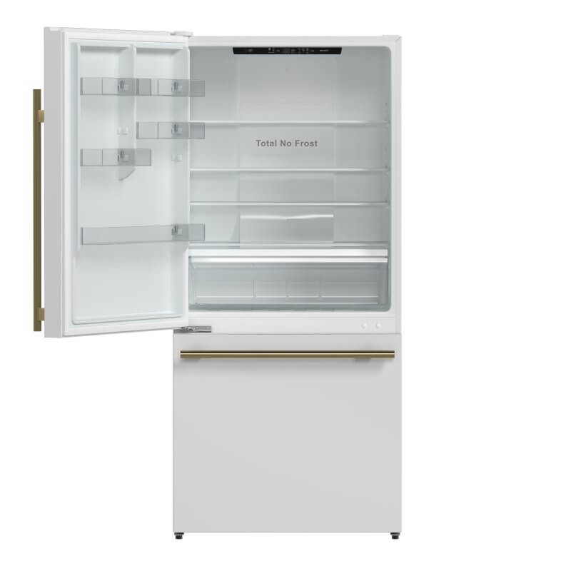 Introducing the FORNO Espresso MIlano 31 Inch Bottom Freezer Refrigerator with ice maker that seamlessly blends style and functionality. Its compact 31 Inch size and 17.2 cu ft capacity offer ample storage without compromising aesthetics. Two full-width freezer drawers optimize organization, while digital touch control ensures precise temperature settings and real-time monitoring. The white finish door maintains a modern look effortlessly. Swift temperature adjustment with Super Cool and Super Freeze safeguards your groceries quality. ENERGY STAR Certified for efficiency, and high-efficiency LED lighting reduces food spoilage. Antique brass handles add an elegant touch, and adjustable features, including shelves, door bins, and a full-width crisper drawer, enhance user-friendliness. Upgrade your kitchen with style, convenience, and freshness!