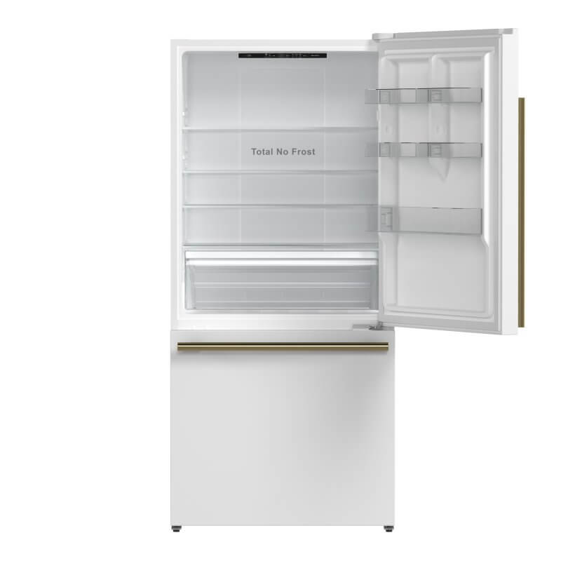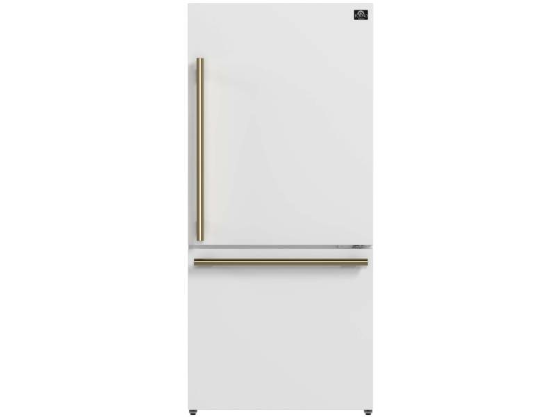 Introducing the FORNO 31 Inch Milano Espresso Bottom Freezer Refrigerator that seamlessly blends style and functionality. Its compact 31 Inch size and 17.2 cu ft capacity offer ample storage without compromising aesthetics. Two full-width freezer drawers optimize organization, while digital touch control ensures precise temperature settings and real-time monitoring. The white finish door maintains a modern look effortlessly. Swift temperature adjustment with Super Cool and Super Freeze safeguards your groceries quality. ENERGY STAR Certified for efficiency, and high-efficiency LED lighting reduces food spoilage. Antique brass handles add an elegant touch, and adjustable features, including shelves, door bins, and a full-width crisper drawer, enhance user-friendliness. Upgrade your kitchen with style, convenience, and freshness!
