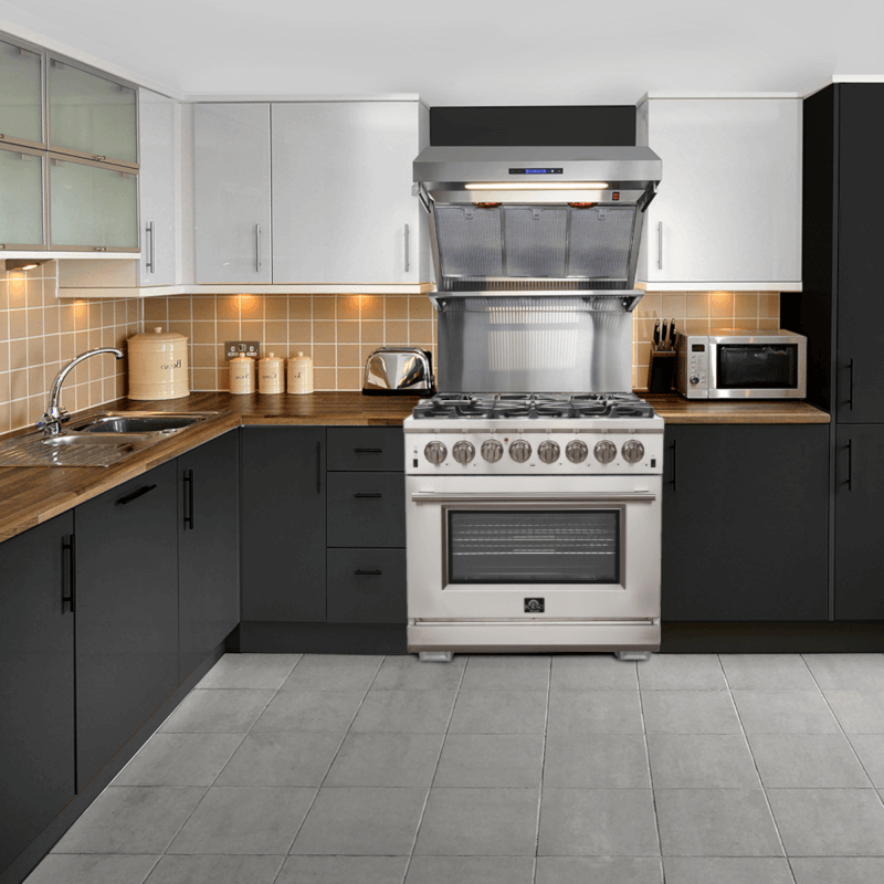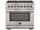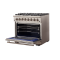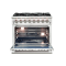 The Forno Capriasca 36-Inch dual fuel range elevates your home kitchen with its durable 304 grade stainless steel design. Featuring 6 sealed dual-ring brass burners with a total output of 120,000 BTU. The 20K dual-ring burner is perfect for boiling or searing and can also handle tasks like melting chocolate or simmering sauces. Continuous heavy-duty cast-iron grates allow for easy sliding of pots or pans off heat when desired. The 5.36 cu.ft. true convection fan oven boasts a blue enamel interior for easy cleaning and a 3-layer glass oven door window for heat retention and a clear view. With a total output of 6,300 Watts, this oven provides ample power for baking, roasting, and broiling. Included are 3 fully telescopic easy-access stainless steel oven racks, concave wok ring, a LP conversion kit. Additionally, zinc-coated metal knobs with bezel rings ensure lasting beauty.