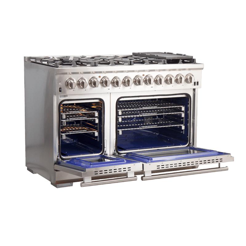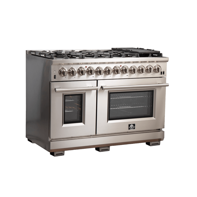 The Forno Capriasca 48 Inch dual fuel range brings professional styling and performance into your home kitchen with its durable stainless steel design. The cooking surface features 8 sealed dual-ring brass burners with a total output of 160,000 BTU. The 20,000 BTU dual-ring burners are perfect for boiling or searing and can also handle tasks like melting chocolate or simmering sauces. Continuous heavy-duty cast-iron grates allow for easy sliding of pots or pans off heat when desired. The two ovens have a combined capacity of 6.58 cu.ft. and boast a total output of 9,700 Watts, providing ample power for baking, roasting, and broiling. The blue enamel interiors make cleaning a breeze, while the 3-layer glass oven door window provides both heat retention and an unobstructed view. The right-side oven features a true convection fan function. Included are 6 fully telescopic easy-access stainless steel oven racks, reversible grill/griddle, complete rotisserie kit including skewer and forks, concave wok ring, an LP conversion kit and a NEMA 14-50P power cord. Additionally, zinc-coated metal knobs with bezel rings will maintain their beauty for years.