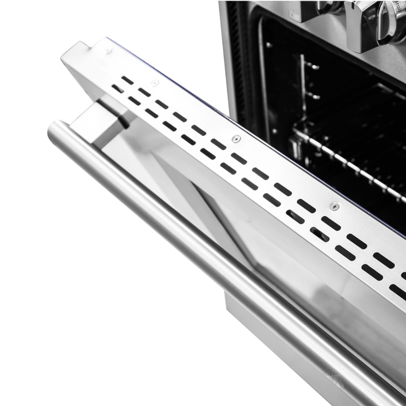 - 3 Heavy-Duty Stainless Steel Telescopic Oven Racks with ball bearing rack guides.