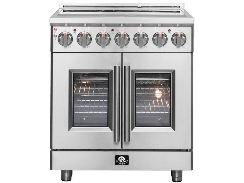 The Forno 30″ Massimo French Door Freestanding Electric Range brings professional styling and quality into your home kitchen with its durable stainless-steel design. The unique french doors allow up to 12-inch opening to easily access your oven.The cooking surface has 5 radiant elements with a total output of 9,500 watts that features a Warmer Zone of 100 watts that will always keep your dishes at the ideal temperature. The cooktop surface benefits from a stainless steel surrounding to ensure long-lasting durability. The 4.32 cu. ft. capacity oven has a combined broil and bake output of 4800 watts and 1500 watt true convection fan. Includes Air Fryer Basket, Rack and Drip Pan, 2 telescopic oven racks and 4-prong power cord. Housed in a high-grade stainless steel body and zinc coated metal knobs with bezels. This unit sports a stylish look that is built to last. Skip the high price tags without sacrificing quality and performance. Lower the cost of living with Forno.