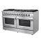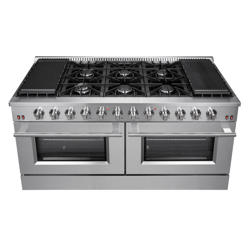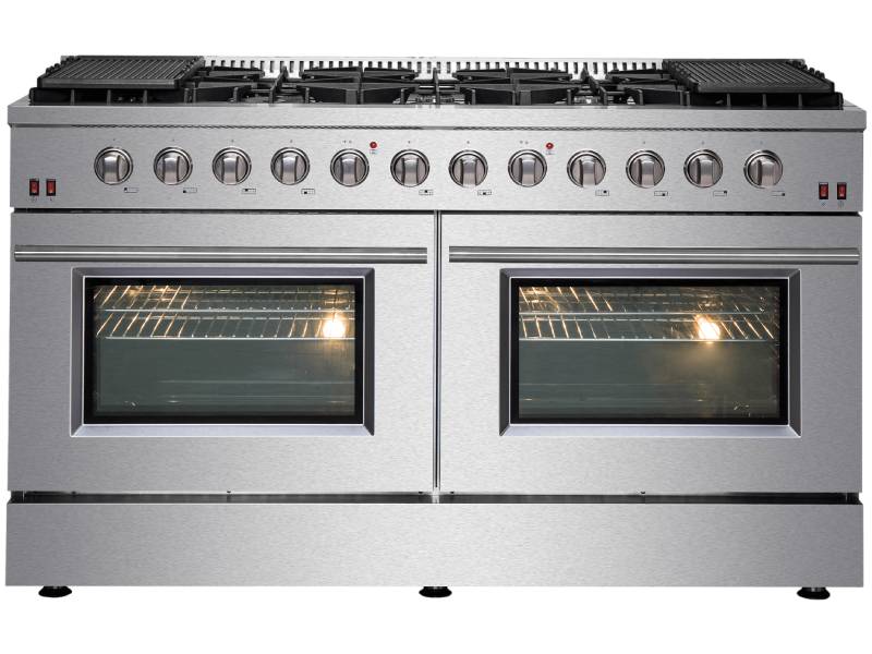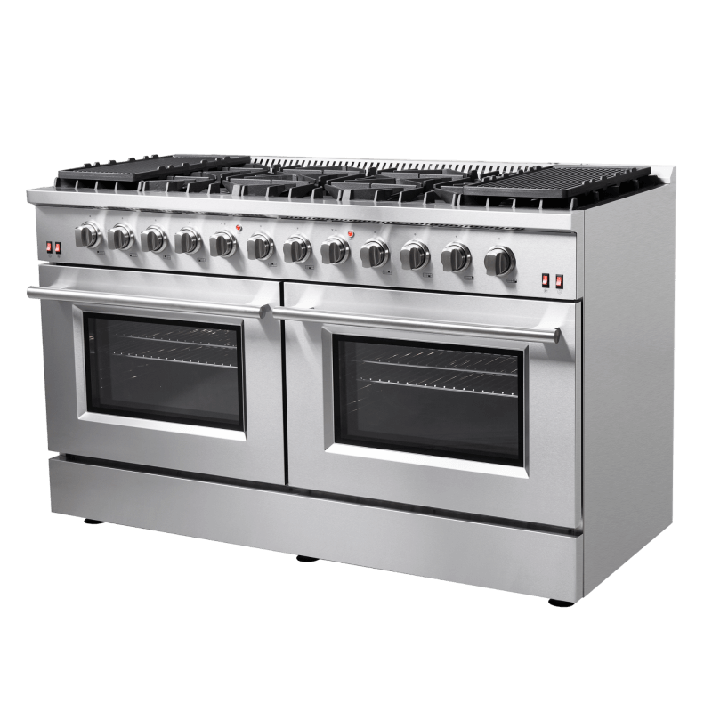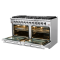 The 60-inch Forno Galiano Gas Range brings professional styling and performance into your home kitchen with its durable stainless-steel design. The cooking surface has 10 sealed burners with a total output of 142,000 BTU, which two are a 20,000 BTU dual-ring burner that can simmer at 1,000 BTU. Continuous cast iron grates ensure stability on the enamel surface. Two convection ovens with a total capacity 8.64 cu.ft with 30,000 BTU Total Broil and Bake output each. Both ovens have an impressive enamel interiors allowing for easy cleaning and 3-layer glass oven door window provides both heat retention and an unobstructed view. It features 2 racks per oven, two reversible griddles, an LP conversion kit, an air-fryer kit with drip pan and durable zinc-coated metal knobs. Elevate your kitchen with performance, convenience, and enduring elegance.