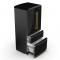 - Sleek black-finished doors with antique brass handles add a distinctive, stylish touch.