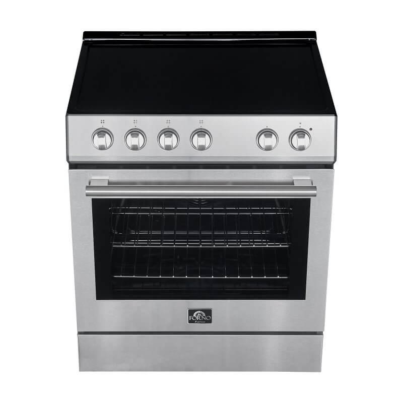 Introducing the Forno Leonardo Espresso 30 Inch 5.0 cu. Ft. Stainless-Steel Electric Range, a true kitchen game-changer. This stunning range combines style and top-notch performance with its stainless steel trim around the ceramic glass, ensuring even heat distribution across its 4 radiant elements. The powerful 5,500-watt convection oven elevates your cooking experience, providing faster and more even cooking results. The hidden bake element simplifies maintenance by preventing spills and odors, making cleanup effortless. Elevate your kitchen with this timeless, user-friendly range that marries durability with sophistication. Cook with confidence and embrace efficiency and style with every use.