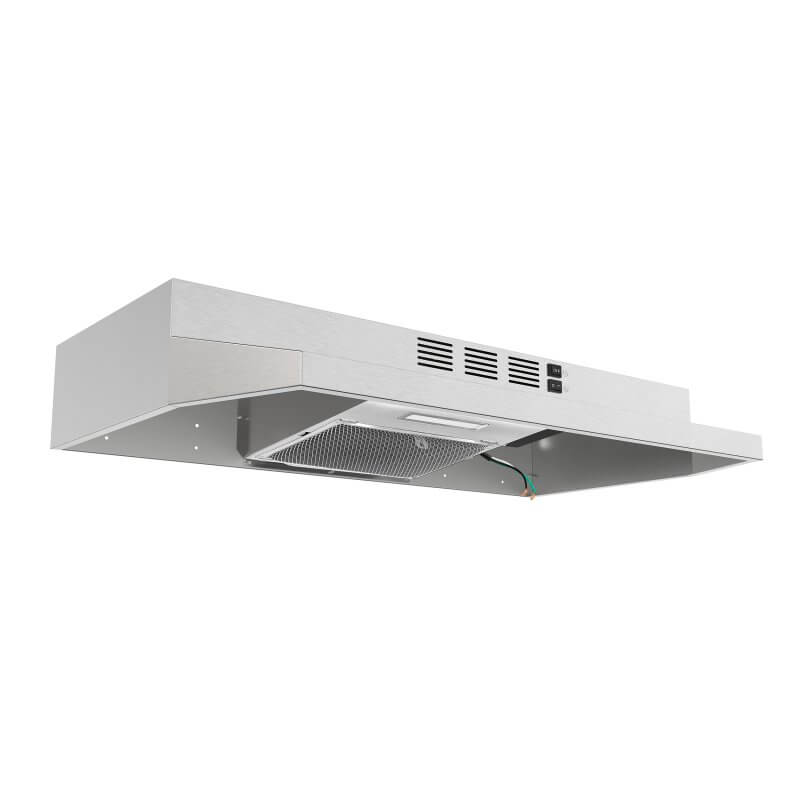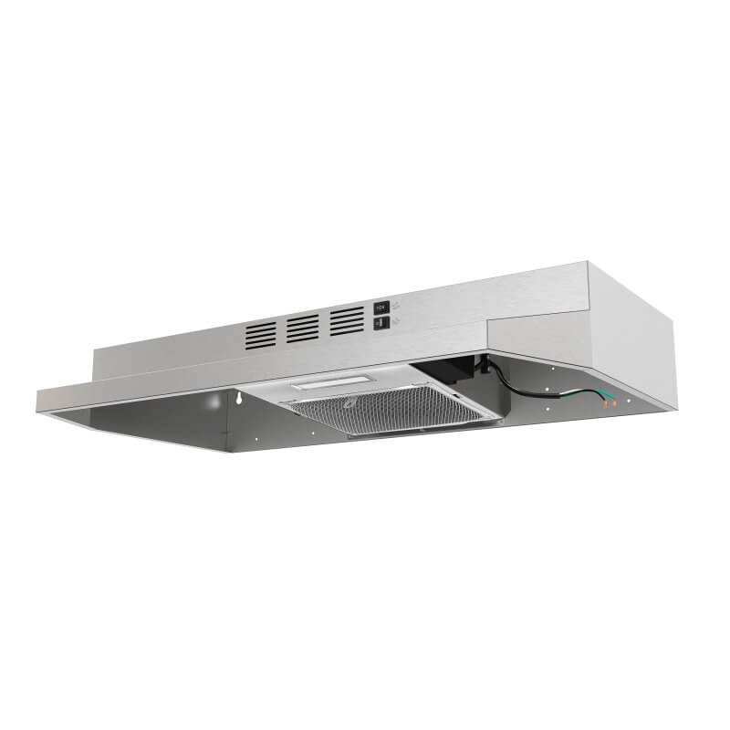The Forno Cappa 30" Under Cabinet Range Hood in stainless steel blends powerful performance with a compact, sleek design, ideal for small kitchens and apartments. Featuring a 2-speed exhaust fan, it effectively removes smoke and odors while operating quietly at 54 dB. The unit offers flexible installation with both ducted and ductless options, complete with dishwasher-safe aluminum mesh filters and a carbon filter for enhanced air quality. Its ultra-slim 4.7" height saves space and fits perfectly under any cabinet. Bright 2W LED lights provide energy-efficient illumination, ensuring clear visibility while cooking. Simple mechanical controls allow easy switching between speeds for customized ventilation. Backed by a 2-year parts and labor warranty, the Forno Cappa range hood is a reliable, stylish choice for any kitchen. Lower the cost of living with Forno.