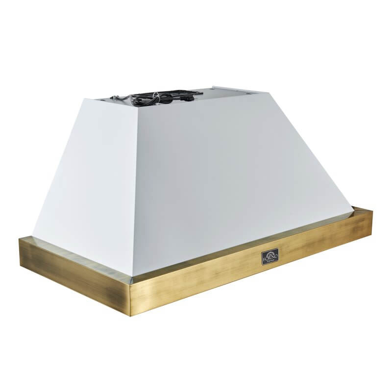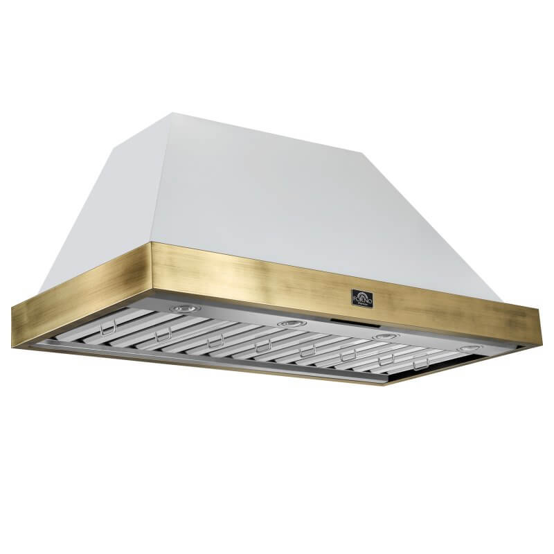 Enhance your kitchen with the Vittorio 48" Range Hood, combining style and performance. With a powerful 600 CFM motor, it efficiently removes smoke, odors, and grease, keeping your kitchen fresh. The 3-speed fan control adapts to any cooking situation, while dishwasher-safe baffle filters make cleanup easy. Enjoy convenient touch and remote controls for effortless operation, and energy-efficient LED lights that brighten your cooking area. The low-noise operation ensures a peaceful kitchen environment. The elegant white design with antique brass detailing adds a vintage touch to your space. Designed for flexible installation, the Vittorio suits both wall-mounted and under-cabinet setups. The 3-minute power-off delay ensures fresh air even after cooking. With a 2-year warranty covering parts and labor, this range hood delivers reliable performance and peace of mind. Lower the cost of living with Forno.