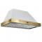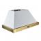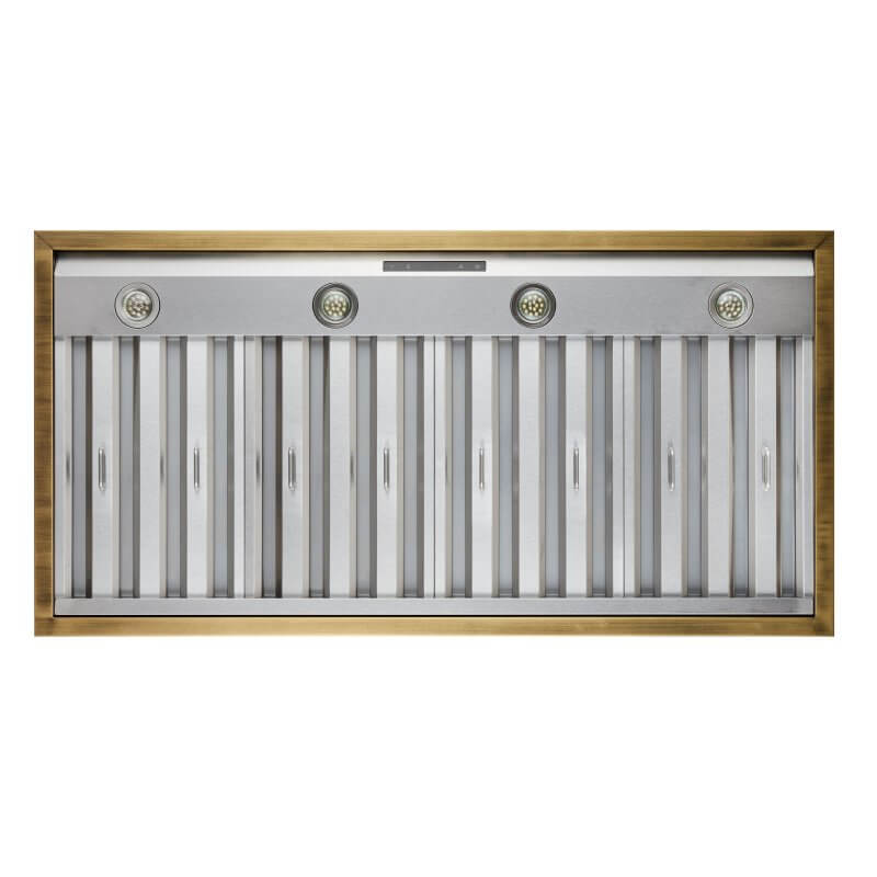 - Elegant white range hood with an elegant antique brass bottom contour, adding a touch of vintage charm to any kitchen.