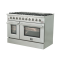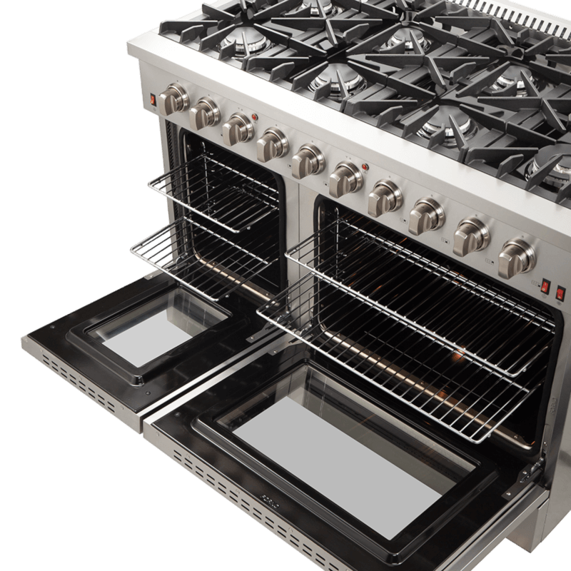 The Forno Galiano 48" Gas Range combines professional-grade performance with sleek stainless steel durability. The cooktop features 8 sealed burners with a total output of 107,000 BTU, including a 20,000 BTU dual-ring burner that can simmer at 1,000 BTU. Our cast iron grates ensure cookware stability and effortless movement between burners. The main convection oven offers 4.32 cu. ft. and delivers a total of 30,000 BTU for broiling and baking, while the secondary oven has a capacity of 2.26 cu. ft. with a 14,00 BTU for baking. Both ovens feature a sleek black enamel interior and a three-layer tempered glass door for superior heat retention and clear visibility. Additional features include 2 oven racks, an LP conversion kit, and durable zinc-coated knobs with bezel rings, built to maintain their beauty. Backed by Forno's 2-year warranty, this range offers peace of mind, lasting performance, and exceptional affordability.