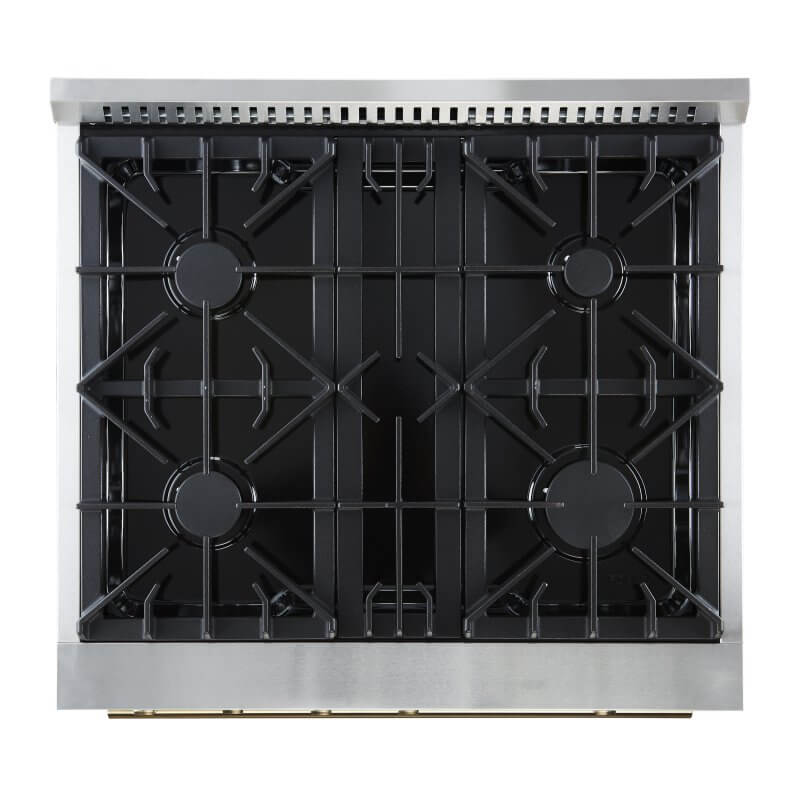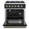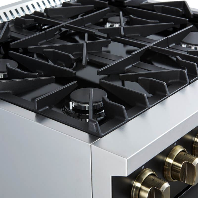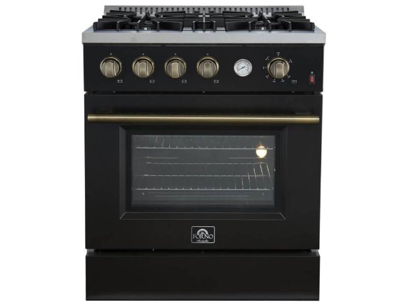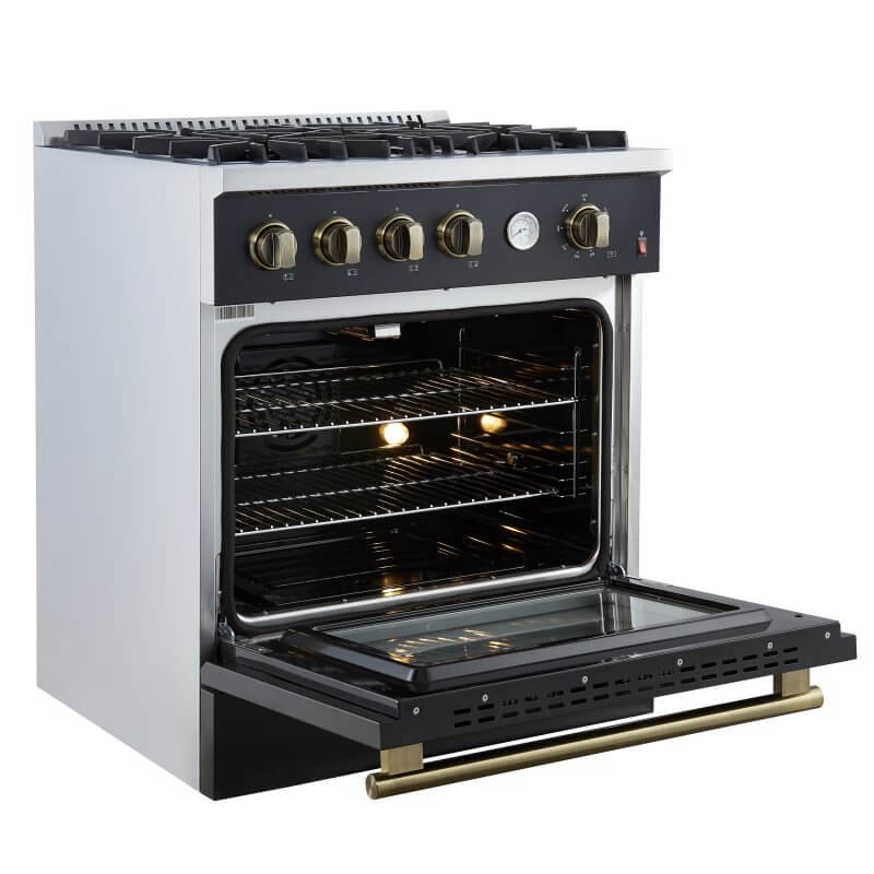 Bring bold design and culinary power to your home with the Marco 30 Inch Alta Qualita Gas Range in sleek black with antique brass accents. Whether you're simmering delicate sauces or searing a juicy steak, the 4 sealed burners, including a dual-ring burner with 37,000 BTU output, meet every need. The 4.32 cu.ft. convection oven guarantees evenly baked cookies and perfectly roasted vegetables. Durable cast iron grates provide stability, while smooth friction hinges and a triple-layer oven door ensure safety and efficiency. Reliable and visually striking, the Marco makes every meal an occasion. Lower the cost of living with Forno.