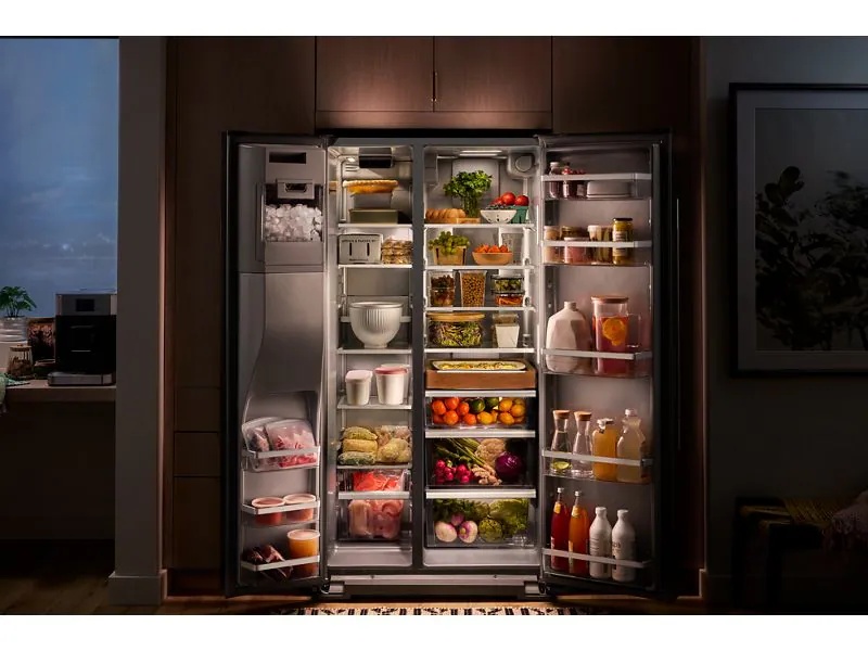 Make room for every grocery run and farmers market haul with this large capacity counter-depth side-by-side refrigerator from KitchenAid brand. Counter-depth design fits with surrounding cabinetry to create a built-in appearance. Panoramic LED Lighting illuminates every angle to keep ingredients in sight and easy to find. And an Exterior Ice and Water Dispenser with Measured Fill allows you to select and dispense the exact amount you need in ounces, cups or liters.