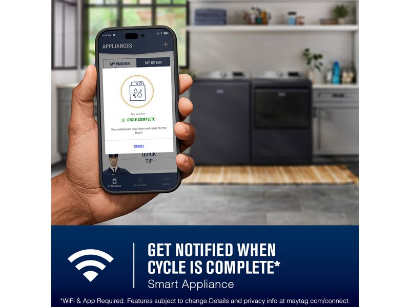Get the MAYTAG™ App to stay in control and efficiently manage laundry from anywhere.*Stay on top of laundry with end of cycle notifications on your smart device to ensure finished loads aren’t left behind. Get step-by-step pretreating instructions in the Stain Guide to take on everyday tough stains and maximize the power of your Maytag® appliances.*Appliance must be set to remote enable. WiFi & App Required. Features subject to change. Details and privacy info at maytag.ca/connect.