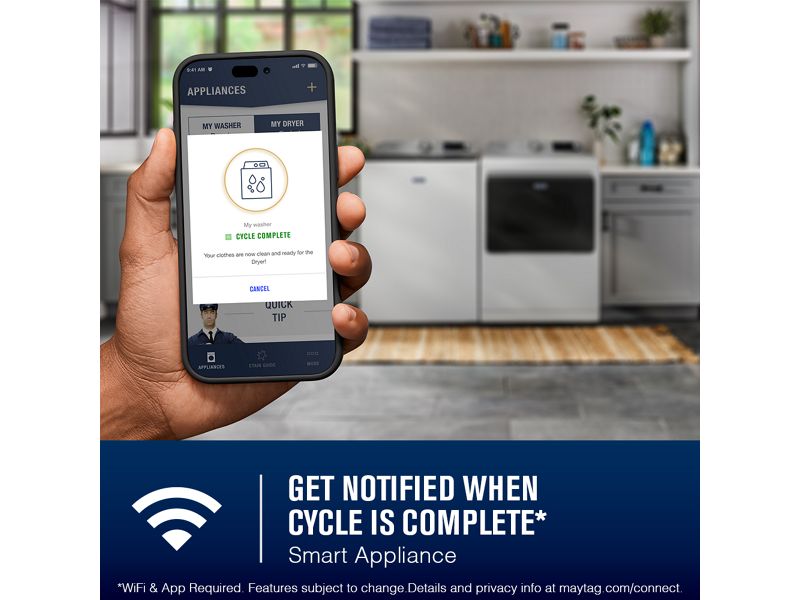 GET THE MAYTAG™ APP to stay in control and efficiently manage laundry from anywhere.*Stay on top of laundry with end of cycle notifications on your smart device to ensure finished loads aren’t left behind. Get step-by-step pretreating instructions in the Stain Guide to take on everyday tough stains and maximize the power of your Maytag® appliances.*Appliance must be set to remote enable. WiFi & App Required. Features subject to change. Details and privacy info at maytag.com/connect.