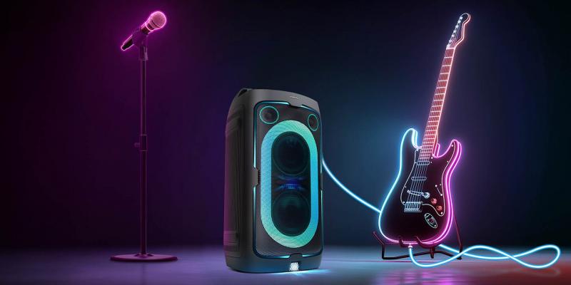 Turn your party into a jam session. Plug in two mics* — or a mic and a guitar — and get ready to sing, play and perform with friends. With the Sound Tower App, unlock special DJ effects so your playlist hits harder than ever.