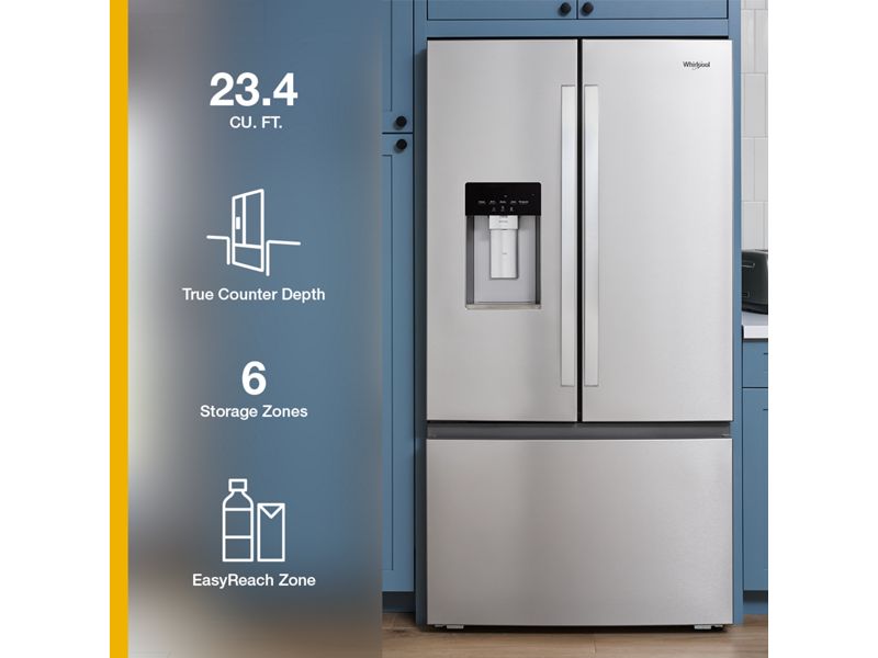 Maximize organization and minimize clutter with 6 organizational zones in this large capacity Whirlpool® True Counter Depth French Door Refrigerator. Organize and access tall items like milk, juice and soda with EasyReach Zone. See & store oversized produce with stacked EasyView Drawers, and shift between temperature settings and store wine, deli items, meat and more with Flexible Temperature Drawer.