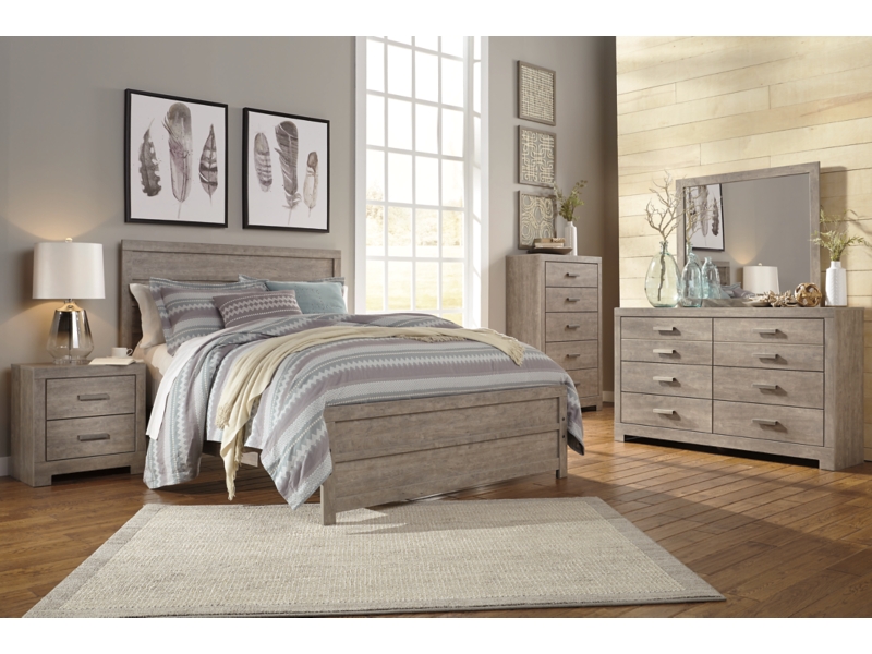 This bedroom package's weathered driftwood finish evokes such an ethereal vibe—exactly what you need for a serene bedroom suite. Chunky moulding on the bed creates a plank-like effect, while clean lines on all pieces in this set make for a timeless look you'll love living with for years to come. Spacious drawers and simple yet substantial hardware offer ample stylish storage for your wardrobe, while USB ports in the nightstand make charging electronics a breeze.