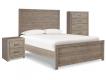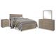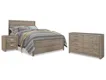 This bedroom package's weathered driftwood finish evokes such an ethereal vibe—exactly what you need for a serene bedroom suite. Chunky moulding on the bed creates a plank-like effect, while clean lines on all pieces in this set make for a timeless look you'll love living with for years to come. Spacious drawers and simple yet substantial hardware offer ample stylish storage for your wardrobe, while USB ports in the nightstand make charging electronics a breeze.