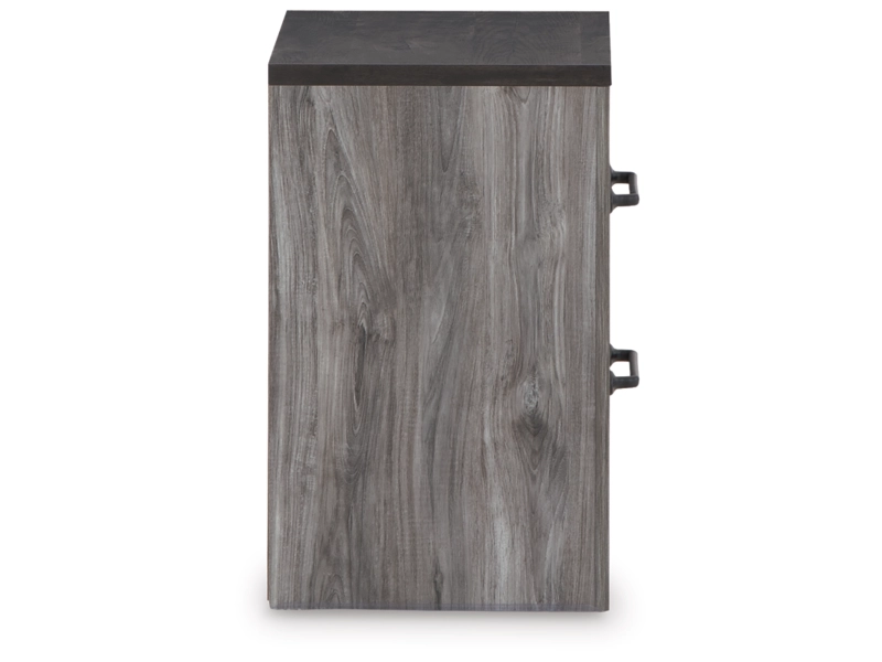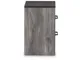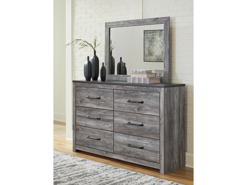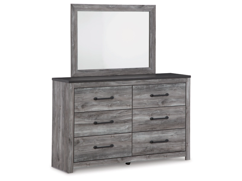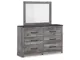 Two-tone finish in smokey gray replicated Oak grain accented with rustic charcoal finish over replicated oak grain with authentic touch. Cases feature a framed front and pilasters. Large scaled dark colored handles. Side roller glides for smooth operating drawers. Drawer interiors lined with a replicated linen design for a clean, finished look. Queen (71) and king (72) headboards can attach to a bolt-on metal bed frame B100-31 or B100-66 respectively. Mirror (36) has the versatility to mount on the dresser or to the wall horizontally or vertically. Safety is a top priority, clothing storage units are designed to meet the most current standard for stability, ASTM F 2057 (ASTM International). Drawers extend out to accommodate maximum access to drawer interior while maintaining safety.
