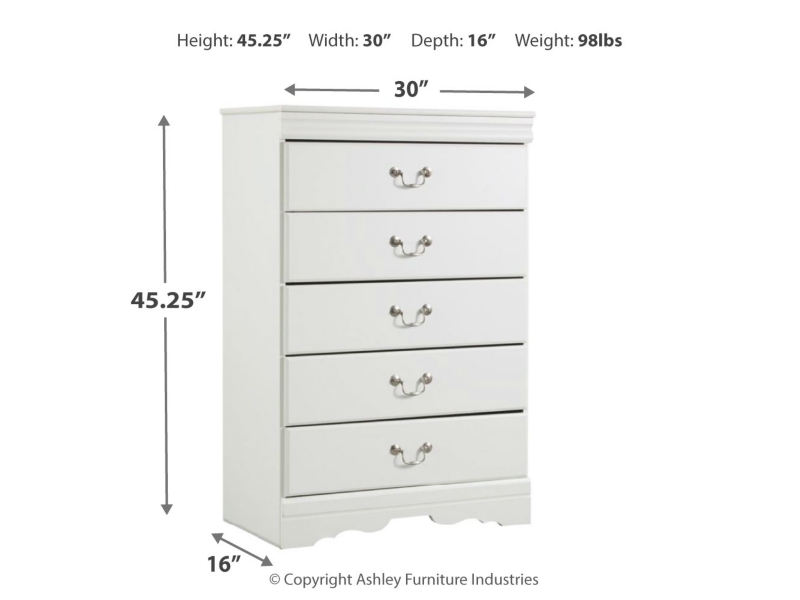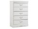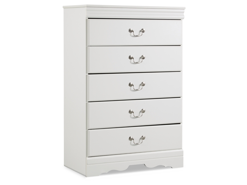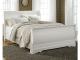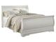 Louis Philippe styling. Replicated white paint. Shapely top mouldings on the case pieces. Antiqued pewter color metal hardware complementing the Louis style. Side roller glide drawer system for smooth operating drawers. Curvaceous footboard panel capped with an elegant sleigh rail. Headboards can attach to a bolt-on metal bed frame B100-21 (twin and full), B100-31 (queen), or B100-66 (king). Safety is a top priority, clothing storage units are designed to meet the most current standard for stability, ASTM F 2057 (ASTM International). Drawers extend out to accommodate maximum access to drawer interior while maintaining safety.
