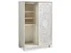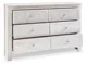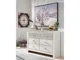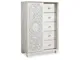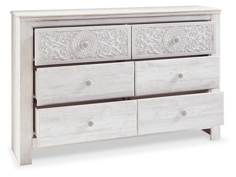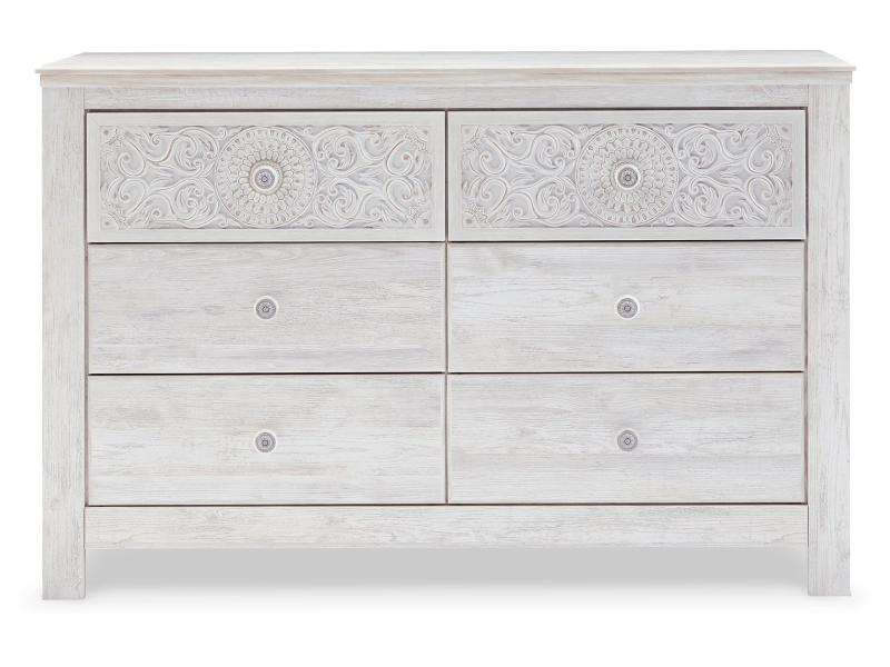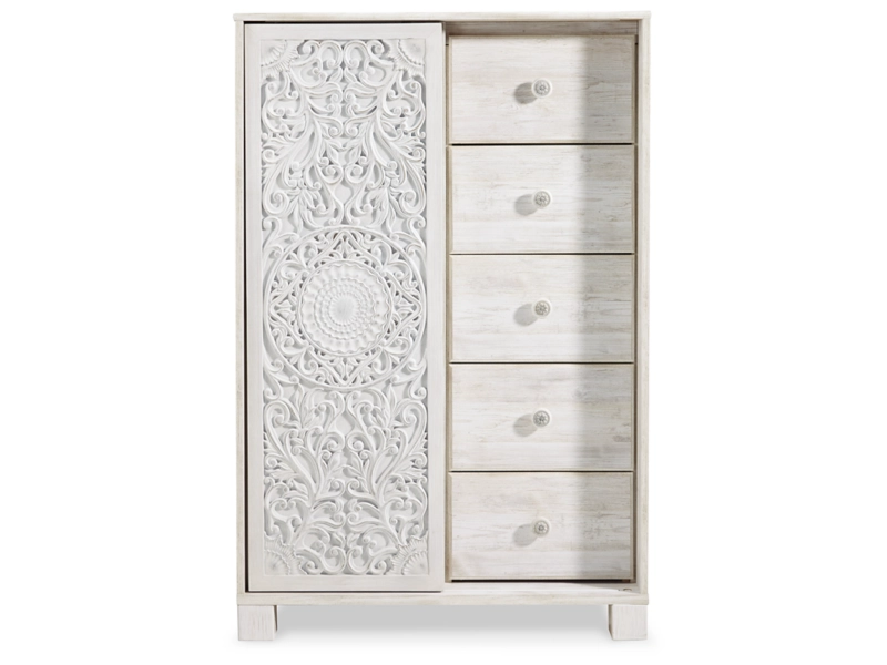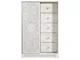White wash replicated worn through paint with authentic touch. Exquisite carved medallion pattern on the headboard and cases. Headboard legs have multiple height options for optimal relationship to bedding height. Cases feature ornate hardware in a worn through painted look. Drawer interiors are lined with a replicated linen design for a clean, finished look. Bedroom collection features case pilasters for a substantial look. Panel headboards (53,87,57) are compatible with EB1181 platform beds (111,112,113). Slim profile dual USB charger located on the back of the night stand tops. Mirror (36) has the versatility to mount on the dresser or to the wall horizontally or vertically. Safety is a top priority, clothing storage units are designed to meet the most current standard for stability, ASTM F 2057 (ASTM International). Drawers extend out to accommodate maximum access to drawer interior while maintaining safety.