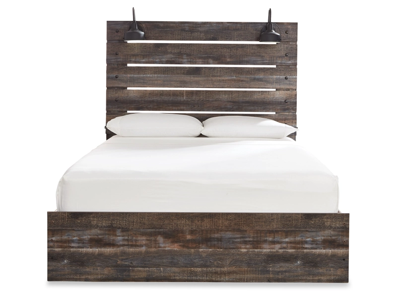 When merged in just the right way, rustic and industrial styles can make one happy marriage. Case in point: this bedroom package. A refined take on barn board beauty, its complex, replicated wood grain showcases hints of burnt orange and teal tones for a sense of weatherworn authenticity. Elongated metal drawer pulls elevate the aesthetic.