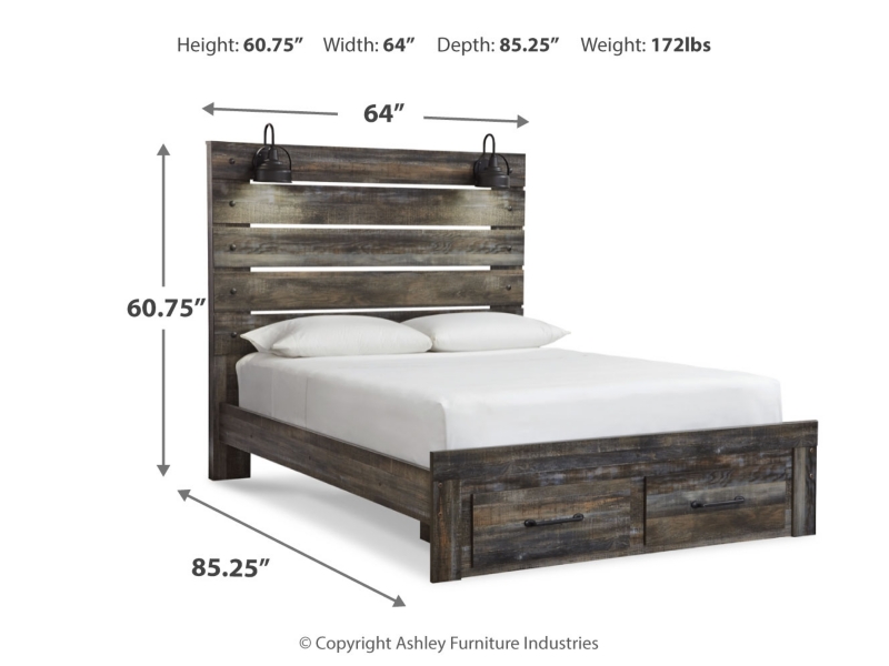 Burnt orange and teal colors accent a brown rustic finish in a replicated woodgrain with authentic touch. Large scaled dark colored handles. Cases feature a framed front and pilasters. All panel headboards (53,57,58,87) feature decorative matte black sconce lights. Side roller glides for smooth operating drawers. All panel headboards (53,57,58,87) can attach to a bolt-on metal bed frame B100-31 or B100-66 respectively. Drawers lined with a faux linen laminate for a clean, finished look. Slim profile dual USB chargers located on the back of the night stand top and the side of the headboards. All side storage options (50,150,60,160) requires the use of the B100-11, B100-12, B100-13 or the B100-14 roll slats. All under bed storage units (50,150,60,160) accommodates to 10.5"W x 10.5"D x 11"H cube storage bins. LED lights accent bookcase headboards (65,69,85). All beds have a panel footboard (52,84,54,56) and storage footboard option (84S,54S,56S). Queen (65) and king (69) headboards can attach to a bolt-on metal bed frame B100-31 or B100-66 respectively. Queen (65) bookcase headboard is capable of attaching a full sized metal bolt on bed frame. Full (85) headboard can attach to a bolt-on metal bed frame B100-21. Safety is a top priority, clothing storage units are designed to meet the most current standard for stability, ASTM F 2057 (ASTM International). Drawers extend out to accommodate maximum access to drawer interior while maintaining safety.