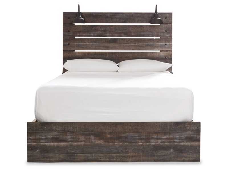 Burnt orange and teal colors accent a brown rustic finish in a replicated woodgrain with authentic touch. Large scaled dark colored handles. Cases feature a framed front and pilasters. All panel headboards (53,57,58,87) feature decorative matte black sconce lights. Side roller glides for smooth operating drawers. All panel headboards (53,57,58,87) can attach to a bolt-on metal bed frame B100-31 or B100-66 respectively. Drawers lined with a faux linen laminate for a clean, finished look. Slim profile dual USB chargers located on the back of the night stand top and the side of the headboards. All side storage options (50,150,60,160) requires the use of the B100-11, B100-12, B100-13 or the B100-14 roll slats. All under bed storage units (50,150,60,160) accommodates to 10.5"W x 10.5"D x 11"H cube storage bins. LED lights accent bookcase headboards (65,69,85). All beds have a panel footboard (52,84,54,56) and storage footboard option (84S,54S,56S). Queen (65) and king (69) headboards can attach to a bolt-on metal bed frame B100-31 or B100-66 respectively. Queen (65) bookcase headboard is capable of attaching a full sized metal bolt on bed frame. Full (85) headboard can attach to a bolt-on metal bed frame B100-21. Safety is a top priority, clothing storage units are designed to meet the most current standard for stability, ASTM F 2057 (ASTM International). Drawers extend out to accommodate maximum access to drawer interior while maintaining safety.