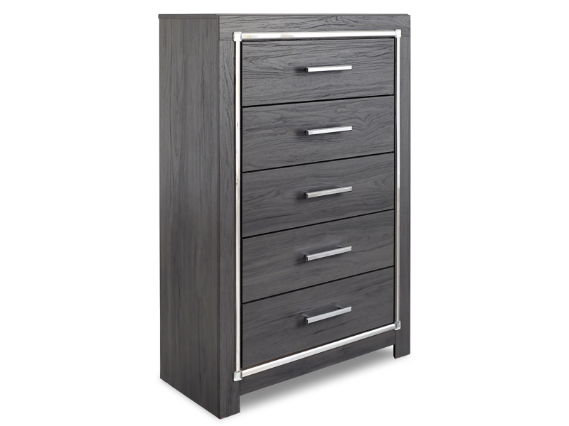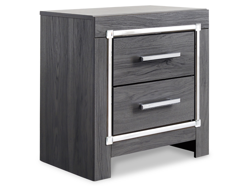 Modern gray finish with replicated wood grain. Cases and bed are accented with faceted chrome details. Large scaled chrome handle with faceted details. Headboards are accented with LED lighting and include a remote for color and brightness options. Included remote holder discretely keeps light remote accessible. Headboards are accented with faux crystal tufted black upholstery. Side roller glides for smooth operating drawers. Drawer interiors are lined with a faux linen laminate for a clean finished look. Both king, queen and full panel beds have a panel footboard (84,54,56) and storage footboard option (84S,54S,56S). Full (87), Queen (57) and King (58) headboards can attach to a bolt-on metal bed B100-21, B100-31 or B100-66 respectively. Queen (57) upholstered panel headboard is capable of attaching a full sized metal bolt on bed frame. Both USB and wireless charging options are provided with the night stand. Queen (54,54S) and king (56,56S) can use -95 platform rails and require B100-13 (queen) or B100-14 (king) roll slats eliminating the need for a box spring. Safety is a top priority, clothing storage units are designed to meet the most current standard for stability, ASTM F 2057 (ASTM International). Drawers extend out to accommodate maximum access to drawer interior while maintaining safety.