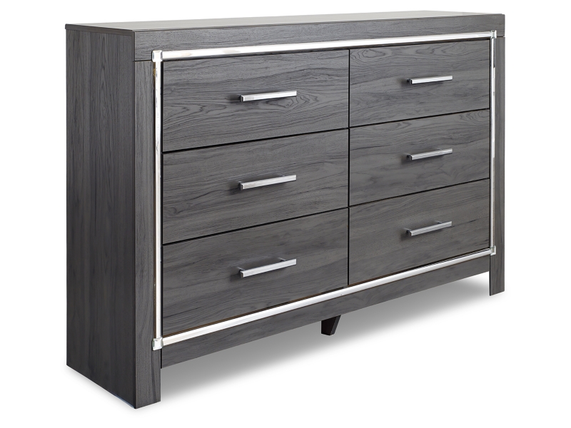 Modern gray finish with replicated wood grain. Cases and bed are accented with faceted chrome details. Large scaled chrome handle with faceted details. Headboards are accented with LED lighting and include a remote for color and brightness options. Included remote holder discretely keeps light remote accessible. Headboards are accented with faux crystal tufted black upholstery. Side roller glides for smooth operating drawers. Drawer interiors are lined with a faux linen laminate for a clean finished look. Both king, queen and full panel beds have a panel footboard (84,54,56) and storage footboard option (84S,54S,56S). Full (87), Queen (57) and King (58) headboards can attach to a bolt-on metal bed B100-21, B100-31 or B100-66 respectively. Queen (57) upholstered panel headboard is capable of attaching a full sized metal bolt on bed frame. Both USB and wireless charging options are provided with the night stand. Queen (54,54S) and king (56,56S) can use -95 platform rails and require B100-13 (queen) or B100-14 (king) roll slats eliminating the need for a box spring. Safety is a top priority, clothing storage units are designed to meet the most current standard for stability, ASTM F 2057 (ASTM International). Drawers extend out to accommodate maximum access to drawer interior while maintaining safety.