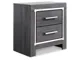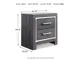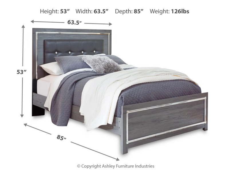 Modern gray finish with replicated wood grain. Cases and bed are accented with faceted chrome details. Large scaled chrome handle with faceted details. Headboards are accented with LED lighting and include a remote for color and brightness options. Included remote holder discretely keeps light remote accessible. Headboards are accented with faux crystal tufted black upholstery. Side roller glides for smooth operating drawers. Drawer interiors are lined with a faux linen laminate for a clean finished look. Both king, queen and full panel beds have a panel footboard (84,54,56) and storage footboard option (84S,54S,56S). Full (87), Queen (57) and King (58) headboards can attach to a bolt-on metal bed B100-21, B100-31 or B100-66 respectively. Queen (57) upholstered panel headboard is capable of attaching a full sized metal bolt on bed frame. Both USB and wireless charging options are provided with the night stand. Queen (54,54S) and king (56,56S) can use -95 platform rails and require B100-13 (queen) or B100-14 (king) roll slats eliminating the need for a box spring. Safety is a top priority, clothing storage units are designed to meet the most current standard for stability, ASTM F 2057 (ASTM International). Drawers extend out to accommodate maximum access to drawer interior while maintaining safety.