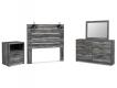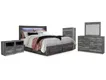 Smokey gray finish over replicated Oak grain with authentic touch. Contemporary handles in an antiqued gunmetal finish. Full, Queen and King storage bed option features 6 drawers of storage. Twin storage bed has 5 drawers. Cases feature faux linen finished drawer interiors. Modern bookcase headboard includes a dimming LED light under the shelf. Slim USB charger located on the back of the night stand tops. Side roller glides for smooth operating drawers. Queen and king storage footboard (54S,56S) requires the B100-13 or B100-14 roll slats. Full storage footboard (84S) requires the B100-12 roll slats. Twin (53) and full (87) headboards can attach to a bolt-on metal bed frame B100-21. Mirror (35) has the versatility to mount on the dresser or to the wall horizontally or vertically. Slim profile dual USB chargers located on the back of the night stand top and the side of the headboards. Queen (57) and King (58) headboards can attach to a bolt-on metal bed frame B100-31 or B100-66 respectively. Safety is a top priority, clothing storage units are designed to meet the most current standard for stability, ASTM F 2057 (ASTM International). Drawers extend out to accommodate maximum access to drawer interior while maintaining safety.