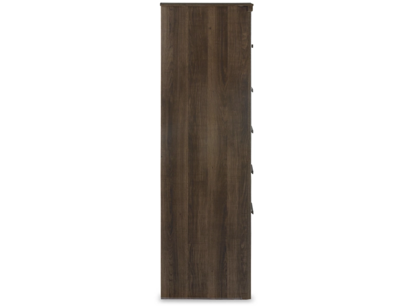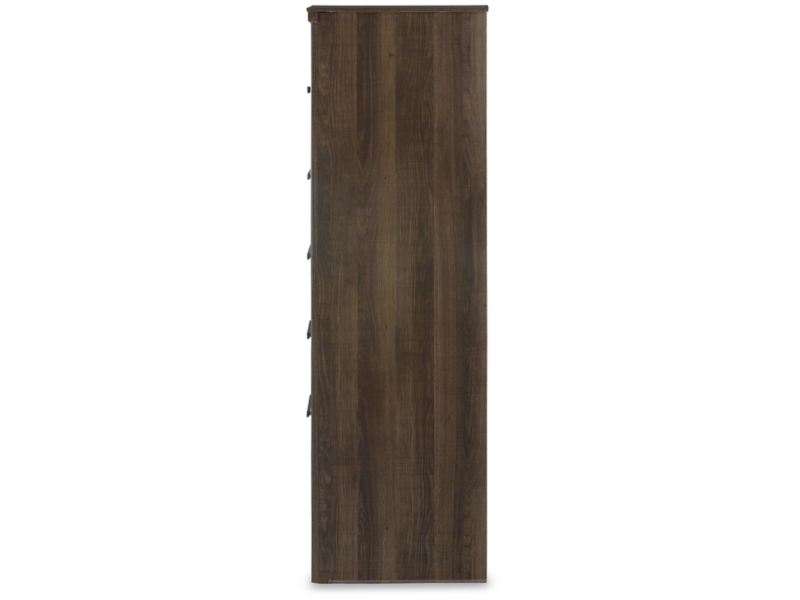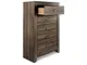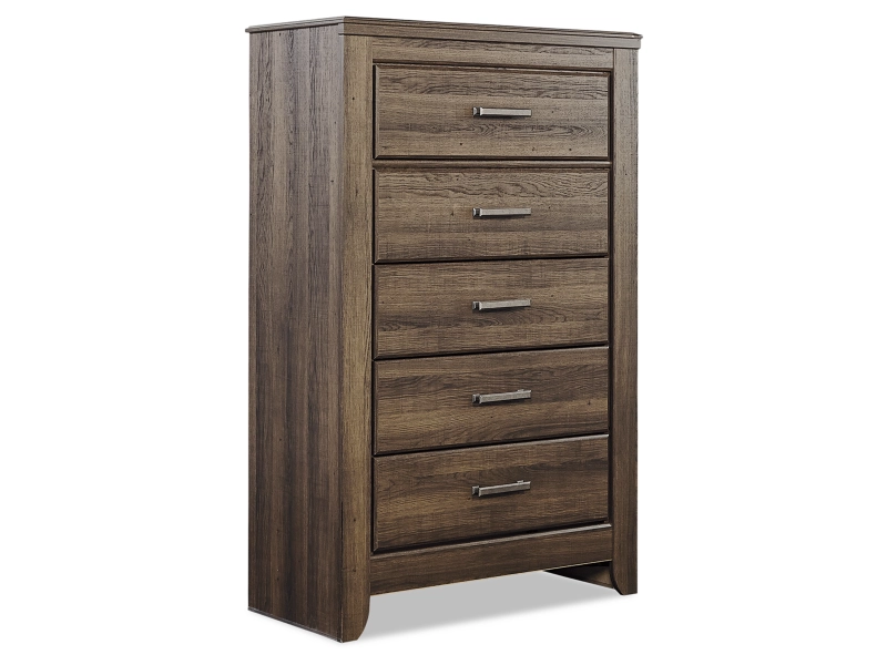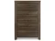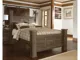Vintage aged brown rough sawn finish over replicated oak grain. Large scaled rustic bedroom collection features case pilasters and thick poster bed posts. Substantial warm pewter color drawer handles. Poster bed offers optional footboard storage. Side roller glides for smooth operating drawers. Queen (57) and king/cal king (58) headboards can attach to a bolt-on metal bed frame B100-31 or B100-66 respectively. Safety is a top priority, clothing storage units are designed to meet the most current standard for stability, ASTM F 2057 (ASTM International). Drawers extend out to accommodate maximum access to drawer interior while maintaining safety.