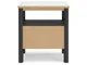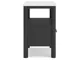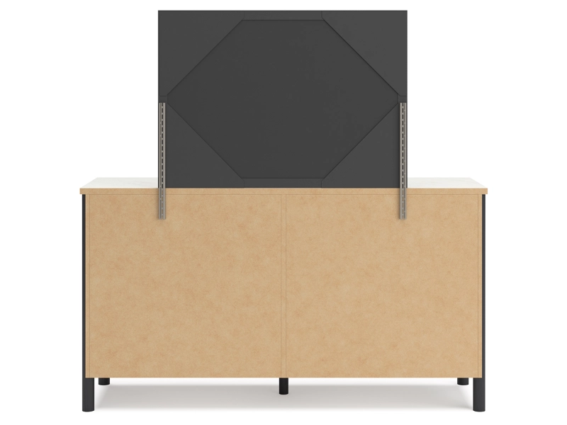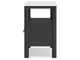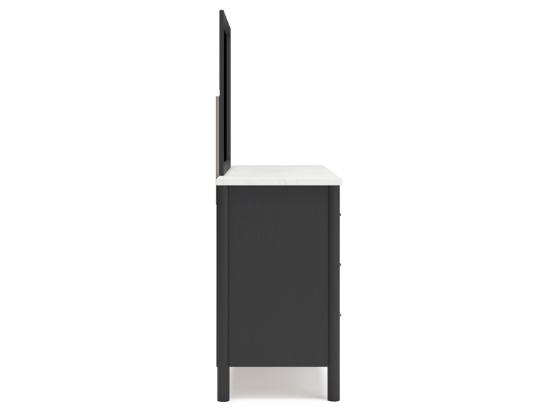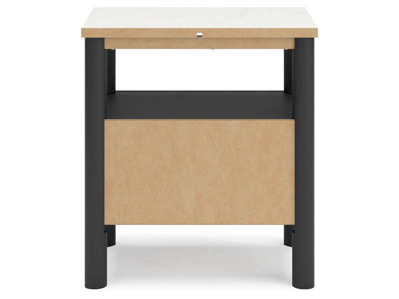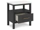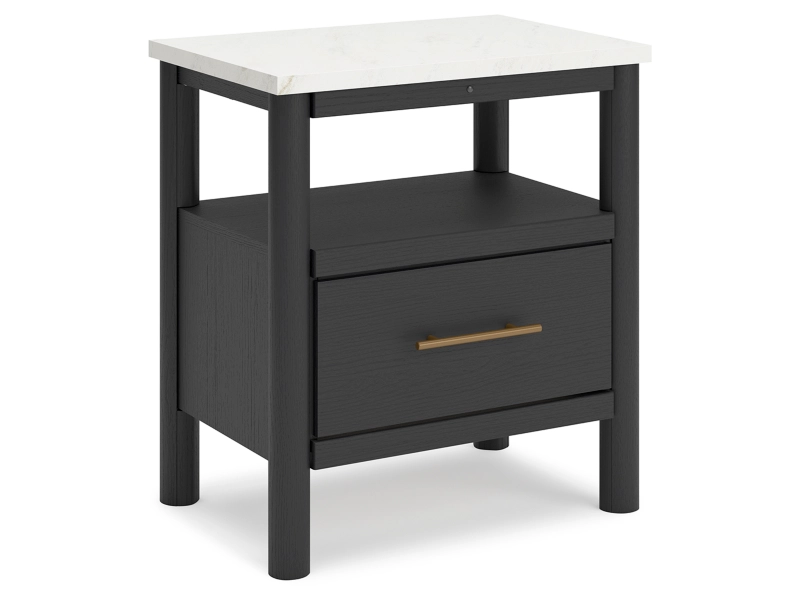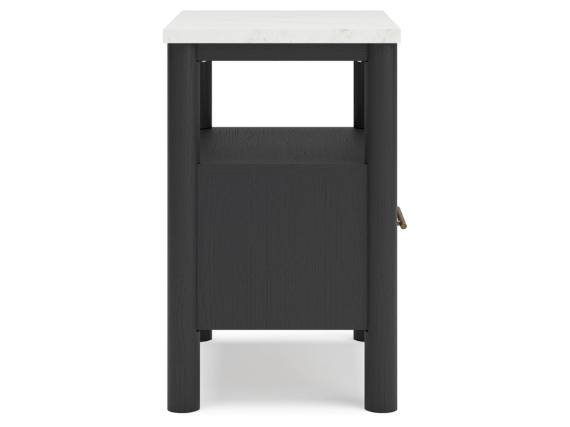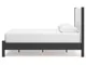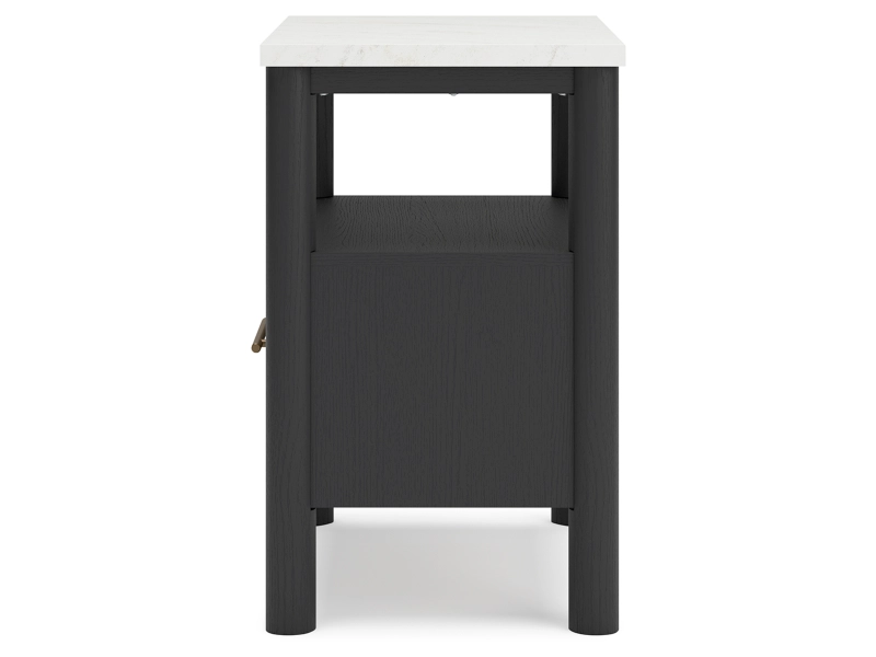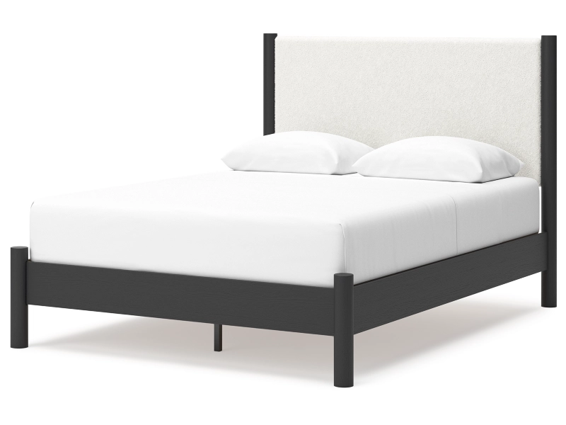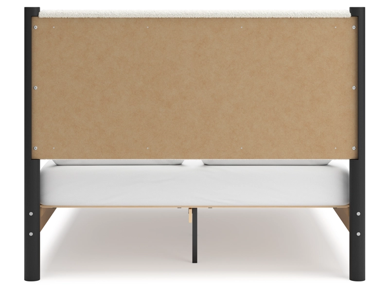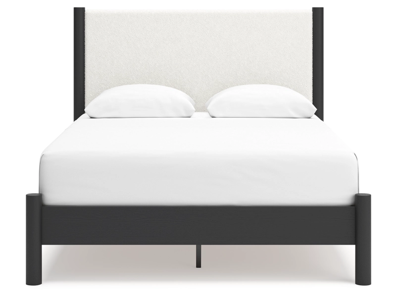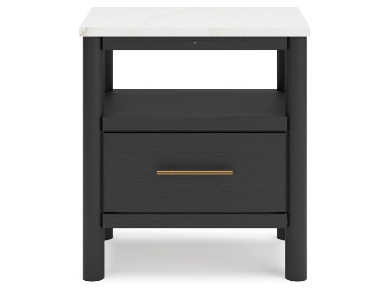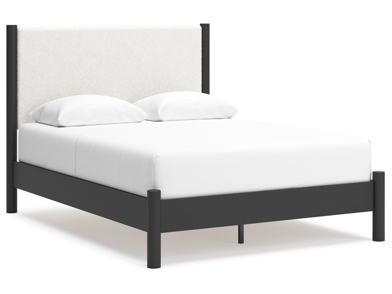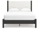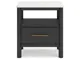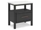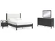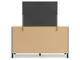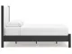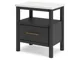 Matte black finish with subtle replicated wood grain accented with a replicated white marble top. Beds and cases feature round post leg details. Cases accented with light bronze colored finished handles. Side roller glides for smooth operating drawers. Drawer interiors are lined with a replicated linen design for a clean, finished look. Both USB and wireless charging options are provided with the nightstands. Nightstand (91) features ambient lighting under the top. Upholstered headboard options (57,58,87) feature a white textural fabric and wooden vertical posts. Headboards (57,58,87) attached to footboards (54,56,84) respectively. Footboards (54,56,84) require the use of B100-12, B100-13 or the B100-14 roll slats. Black upholstered bed full (72), queen (81), king (82) do not require additional foundation/box spring; accommodates most zero clearance adjustable bases. Safety is a top priority, clothing storage units are designed to meet the most current standard for stability, ASTM F 2057 (ASTM International). Drawers extend out to accommodate maximum access to drawer interior while maintaining safety. Minor assembly required.