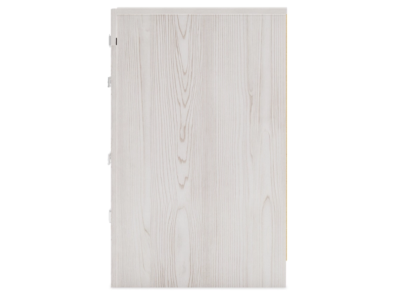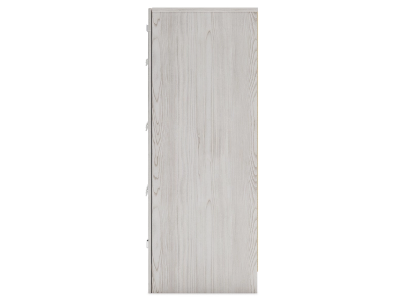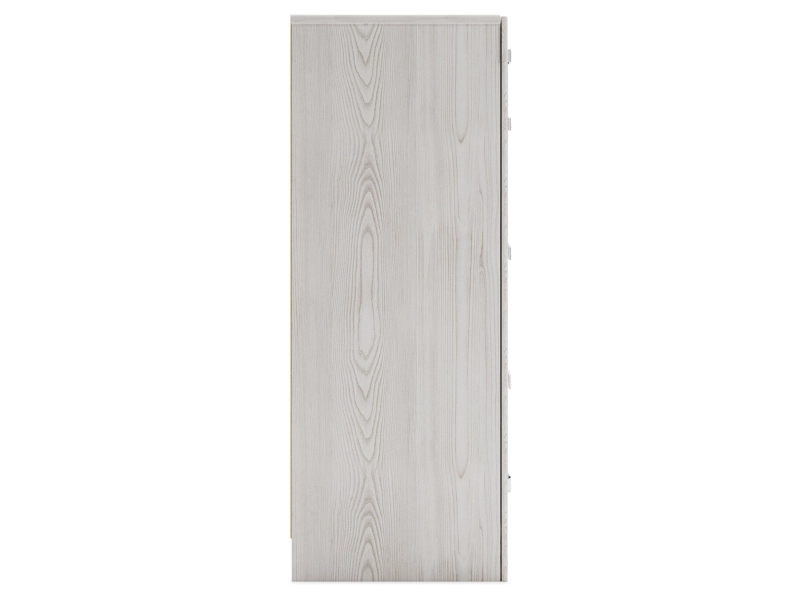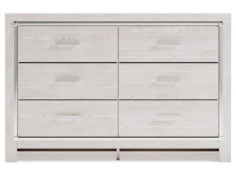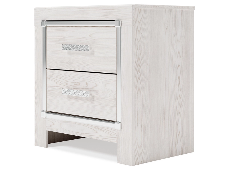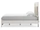 Light finish with subtle pearl effect over replicated cedar grain and authentic touch. Cases and bed are accented with faceted chrome details. Large scaled chrome handle with mosaic details. Side roller glides for smooth operating drawers. Drawer interiors lined with a replicated linen design for a clean finished look. Queen/full (57) and king/cal king (58) upholstered panel headboards are accented with LED lighting and include a remote for color and brightness options. Included remote holder discreetly keeps light remote accessible. Queen (57,65) and king (58,69) headboards are accented with emulated crystal tufted gray upholstery. Queen (65) and king (69) upholstered panel bookcase headboards feature glitter details accented with LED lighting. Both king and queen beds have a panel footboard (54,56) and storage footboard option (54S,56S). Queen (57,65) and king (58,69) headboards can attach to a bolt-on metal bed B100-31 or B100-66 respectively. Queen (57) panel headboard is capable of attaching a full sized metal bolt on bed frame. Both USB and wireless charging options are provided with the nightstand. Queen (54,54S,65) and king (56,56S,69) can use -95 platform rails and require B100-13 (queen) or B100-14 (king) roll slats eliminating the need for a box spring. Safety is a top priority, clothing storage units are designed to meet the most current standard for stability, ASTM F 2057 (ASTM International). Drawers extend out to accommodate maximum access to drawer interior while maintaining safety.