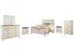 Two-tone finish in white wash replicated worn through paint with authentic touch and a replicated wood grained block pattern with authentic touch. Large scaled shapely bedroom collection features bun feet. Ring pull hardware in an antique brass color, accented with white paint hang up. Side roller glides for smooth operating drawers. Slim profile dual USB charger located on the back of the night stand tops. Queen (57) panel headboard can attach to bolt-on metal bed frame B100-31. Queen (57) panel headboard is capable of attaching a full sized metal bolt on bed frame. Queen (77) and king (78) headboards can attach to a bolt-on metal bed B100-31 or B100-66 respectively. B267-48 has a sliding door over open shelves and five drawers of storage. Safety is a top priority, clothing storage units are designed to meet the most current standard for stability, ASTM F 2057 (ASTM International). Drawers extend out to accommodate maximum access to drawer interior while maintaining safety.