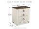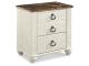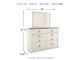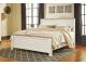 Two-tone finish in white wash replicated worn through paint with authentic touch and a replicated wood grained block pattern with authentic touch. Large scaled shapely bedroom collection features bun feet. Ring pull hardware in an antique brass color, accented with white paint hang up. Side roller glides for smooth operating drawers. Slim profile dual USB charger located on the back of the night stand tops. Queen (57) panel headboard can attach to bolt-on metal bed frame B100-31. Queen (57) panel headboard is capable of attaching a full sized metal bolt on bed frame. Queen (77) and king (78) headboards can attach to a bolt-on metal bed B100-31 or B100-66 respectively. B267-48 has a sliding door over open shelves and five drawers of storage. Safety is a top priority, clothing storage units are designed to meet the most current standard for stability, ASTM F 2057 (ASTM International). Drawers extend out to accommodate maximum access to drawer interior while maintaining safety.