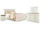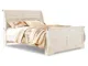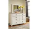 Two-tone finish in white wash replicated worn through paint with authentic touch and a replicated wood grained block pattern with authentic touch. Large scaled shapely bedroom collection features bun feet. Ring pull hardware in an antique brass color, accented with white paint hang up. Side roller glides for smooth operating drawers. Slim profile dual USB charger located on the back of the night stand tops. Queen (57) panel headboard can attach to bolt-on metal bed frame B100-31. Queen (57) panel headboard is capable of attaching a full sized metal bolt on bed frame. Queen (77) and king (78) headboards can attach to a bolt-on metal bed B100-31 or B100-66 respectively. B267-48 has a sliding door over open shelves and five drawers of storage. Safety is a top priority, clothing storage units are designed to meet the most current standard for stability, ASTM F 2057 (ASTM International). Drawers extend out to accommodate maximum access to drawer interior while maintaining safety.