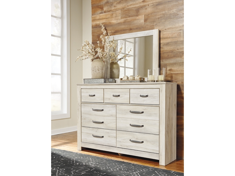 Your bedroom isn't just a room. It's a canvas. Express your farmhouse style with this bedroom package. Wispy white finish over replicated oak wood grain brightens up the space with charm. Brushed nickel-tone handles with black edging finesse the pieces with a bit of shine. This clean-lined profile is the perfect authentic foundation for inviting decor.