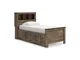 Warm rustic plank finish over replicated Oak grain and authentic touch. Tops of cases and headboard/footboard panels are captured with a nail trimmed corner piece. Side roller glides for smooth operating drawers. Handles feature nailhead trim in a dark bronze metal finish. Slim profile dual USB charger located on the back of the night stand tops. B100-11, B100-12 can be used in substitution of a box spring on the twin or full panel beds. Poster bed offers optional footboard storage. Safety is a top priority, clothing storage units are designed to meet the most current standard for stability, ASTM F 2057 (ASTM International). Drawers extend out to accommodate maximum access to drawer interior while maintaining safety.