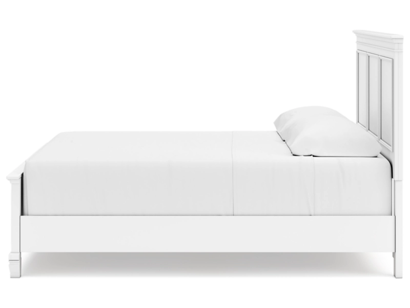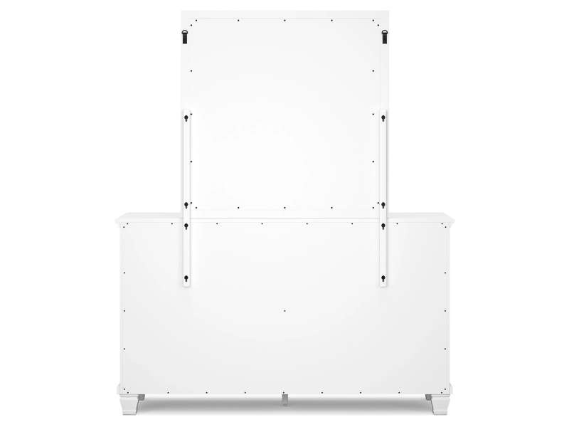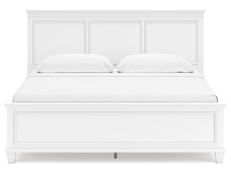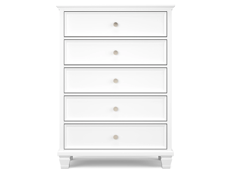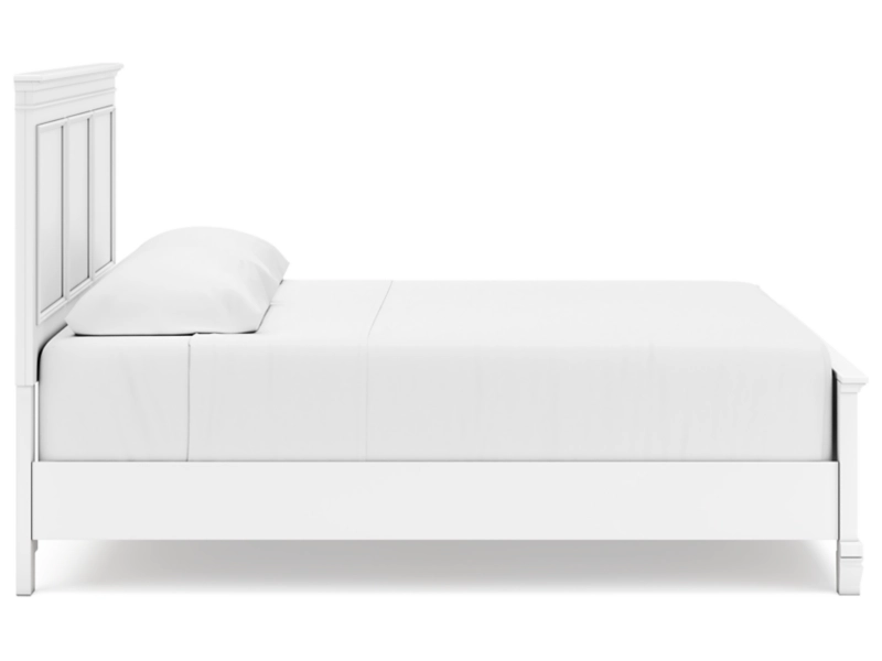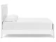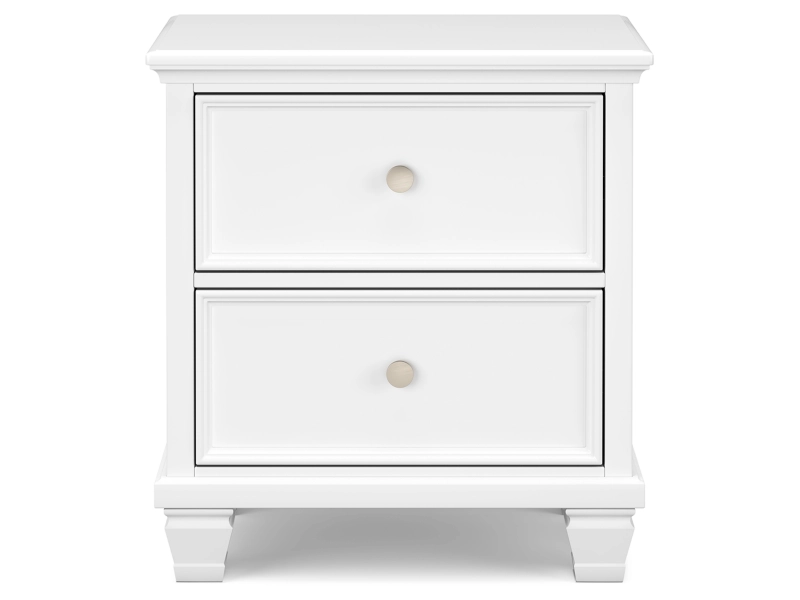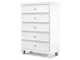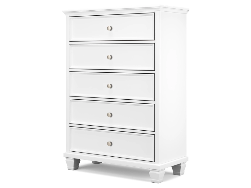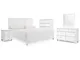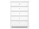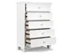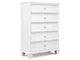 Timeless casual design. Made with hardwood solids and MDF substrate. Clean contemporary white painted finish. Round metal drawer knobs with a satin nickel color finish. Drawers feature French/English dovetail construction with metal ball-bearing side glides. Thick profiled tops, framed drawer fronts and traditional tapered feet. The storage drawers in the footboard offer extra deep space for storing larger bedroom essentials. Full roll slat foundation for mattress only. No foundation box spring required.