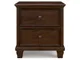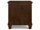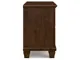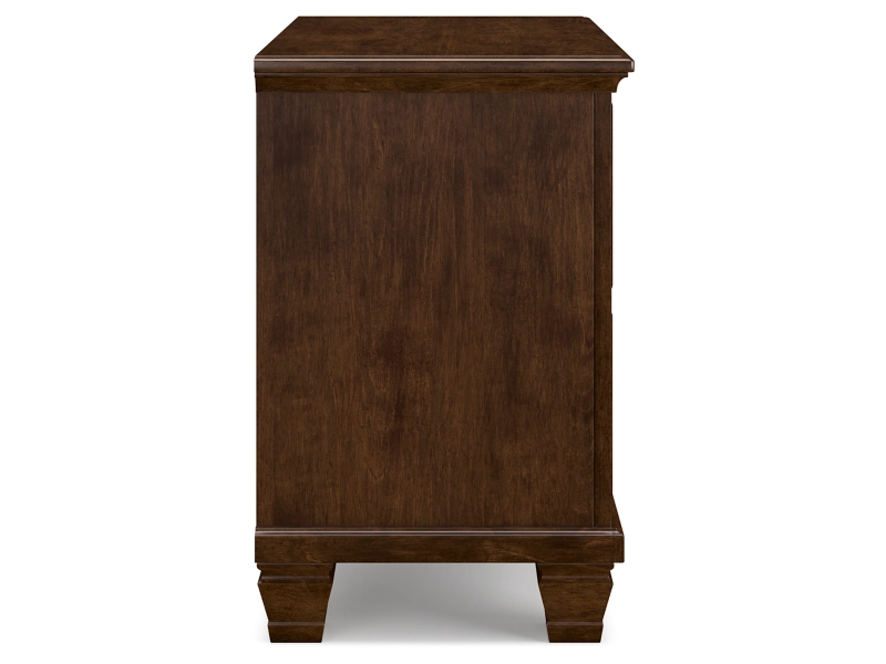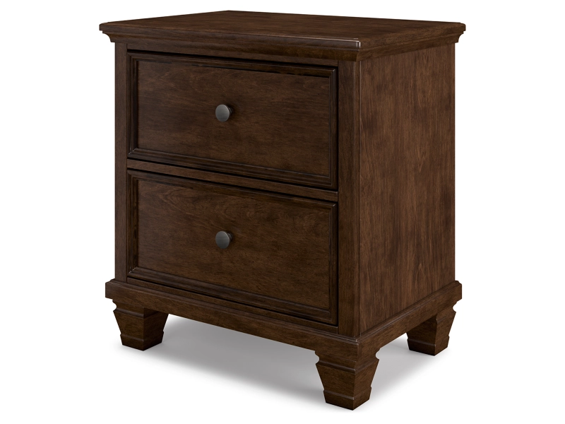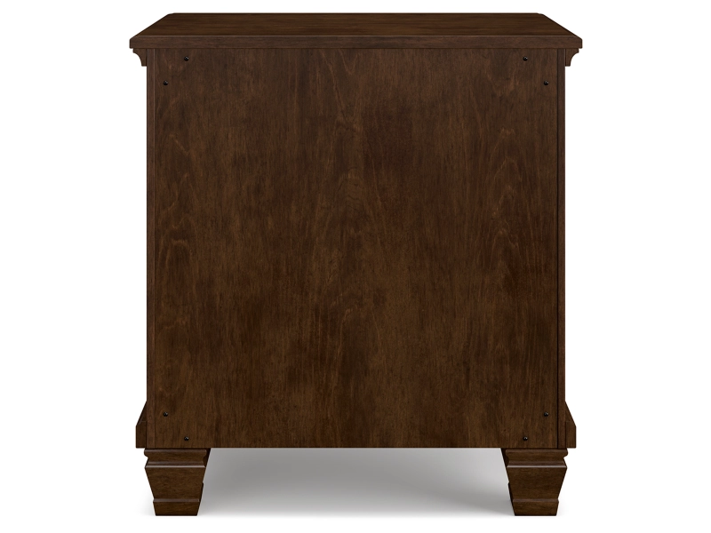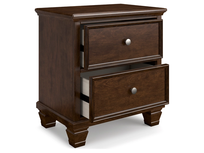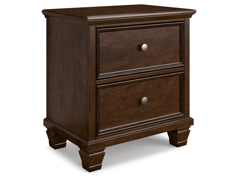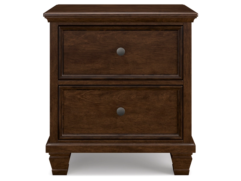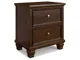 Timeless casual design. Made with hardwood solids, birch veneer and MDF substrate. Rich brown cherry color finish. Round metal drawer knobs with a satin nickel color finish. Drawers feature French/English dovetail construction with metal ball-bearing side glides. Thick profiled tops, framed drawer fronts and traditional tapered feet. The storage drawers in the footboard offer extra deep space for storing larger bedroom essentials. Full roll slat foundation for mattress only. No foundation box spring required.