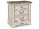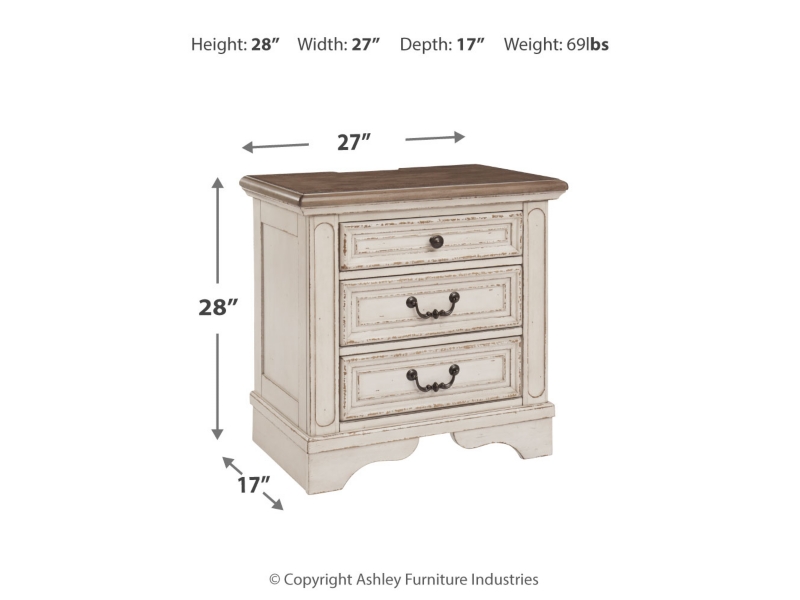 Traditional cottage design. Antiqued two-tone finish featuring chipped white cases with distressed wood finished tops. Tops feature Oak veneers, while the cases are made with engineered wood substrates and Poplar solids. Framed drawer fronts and overlay decorative corbels dress the cases nicely. Ornately shaped headboard with inset upholstered cushion and matching mirror frame. Dovetail drawer construction with ball-bearing side glides. B743-93 nightstand features an AC power supply with dual USB charging ports. B743-22 (3) drawer vanity, mirror, linen colored upholstered stool. Vanity mirror dimension: 28"W x 1"D x 26"H. Vanity stool dimension: 19"W x 14"D x 18"H. B743-54S/56S double storage drawer footboard features ball-bearing side glides and cushioned top rail. Storage footboard and side rails are compatible with the in-line headboard. The bench rail is 8” deep.