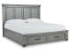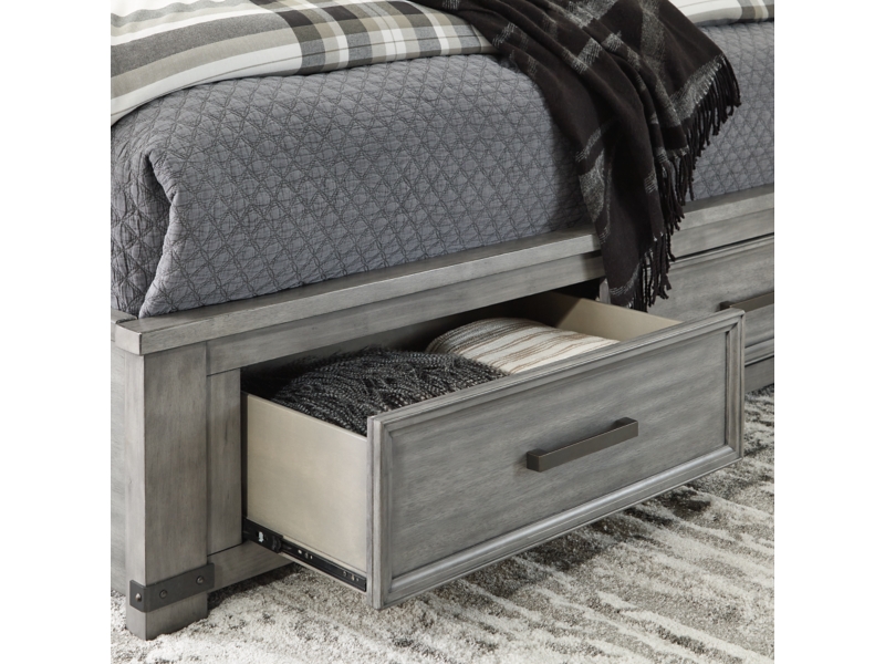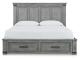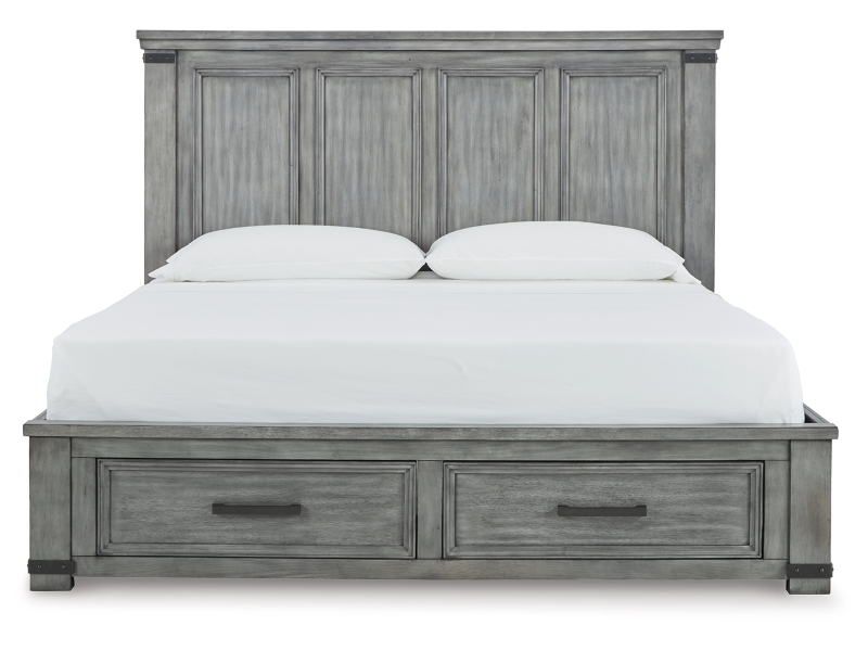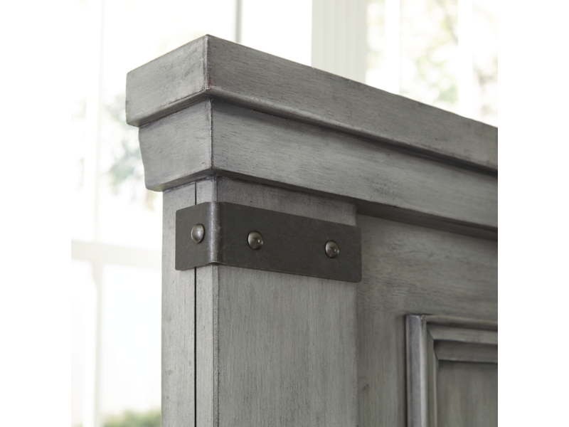 With its light weathered gray coloration, this storage bedroom set conveys trend-right urban farmhouse style. Thick-profiled top moulding on the tall, mansion-scale headboard lends a fresh take on a timeless design. The footboard features two storage drawers with profiled frames and dovetail construction. Bar pulls and metal straps in a dark aged bronze tone add to the rustic-yet-refined aesthetic.