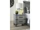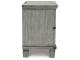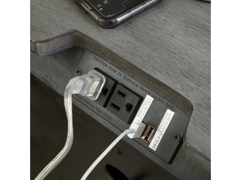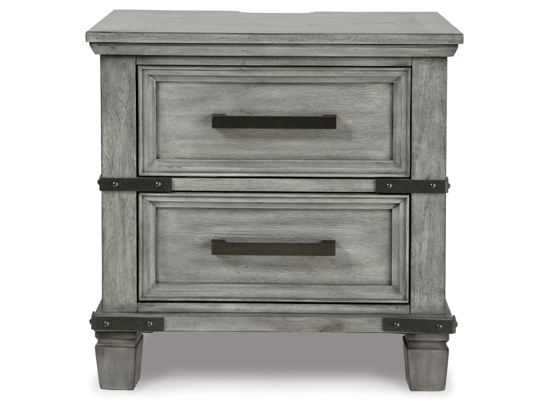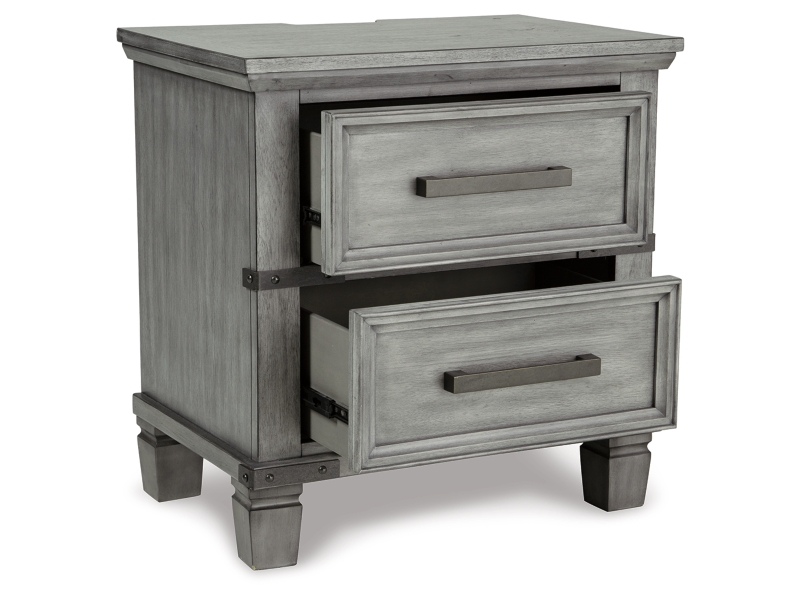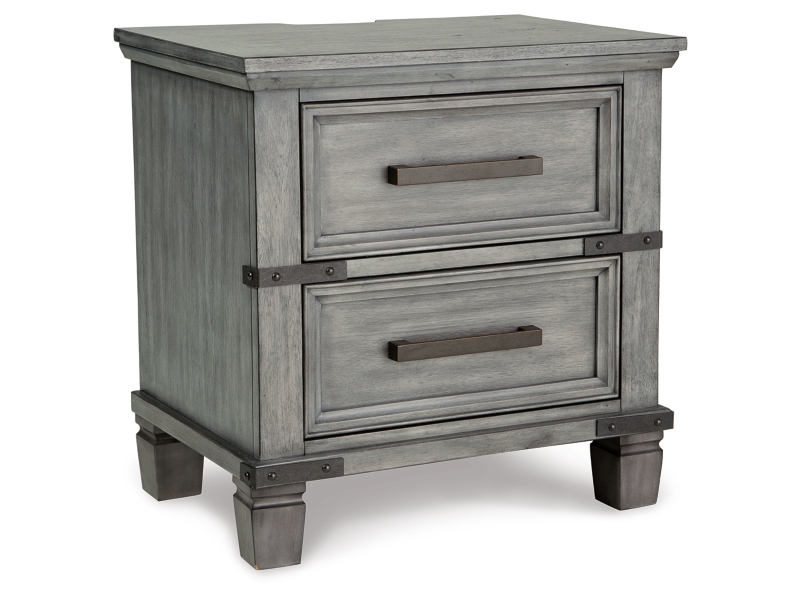 Urban Farmhouse styling. Made with Acacia solids and veneer with engineered wood substrate. Finished with a light weathered gray coloration accented with dark aged bronze bar pulls and metal straps. Dovetail drawer construction with metal ball-bearing side glides. Profiled drawer frames, thick profiled top moulding and tapered legs earmark a timeless case design. The tall mansion scale bed features storage drawers in the footboard. The two drawer nightstand includes a 110V power supply with dual USB charging ports.