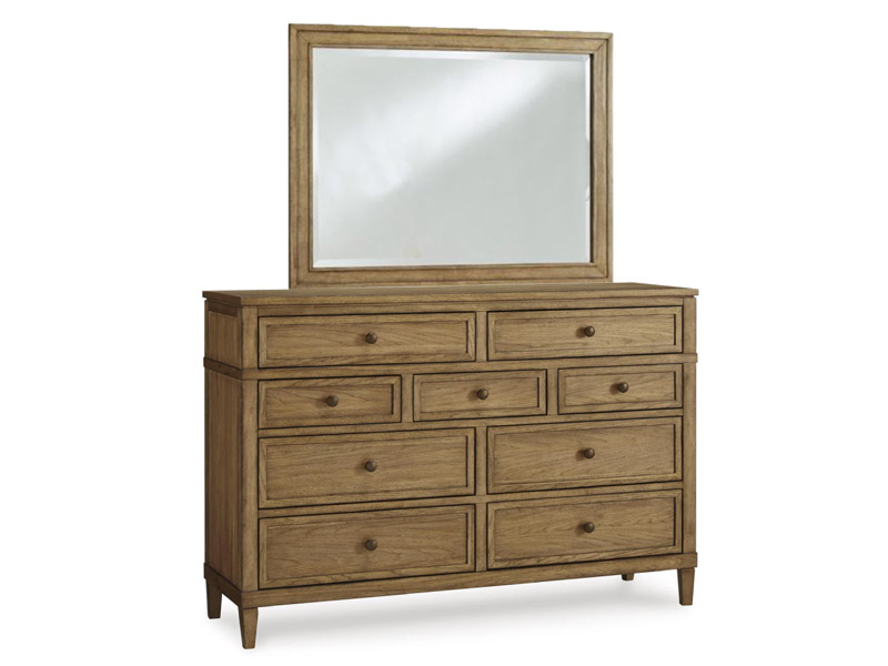 Taking a timeless approach to bedroom beauty, this dresser with mirror brings easygoing elegance to the everyday. With its light brown wood tone, it seamlessly slips into your room’s aesthetic. Dark bronze-tone pulls accent the assorted storage drawers, adding to this dresser's fresh approach to transitional stylings.